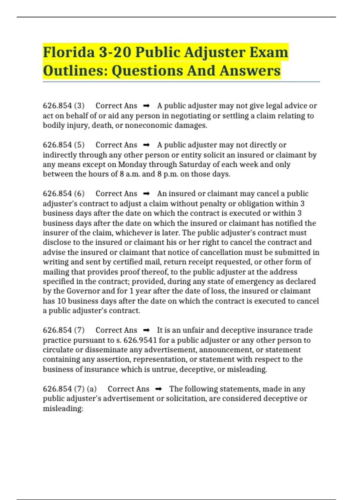 Florida 3-20 Public Adjuster Exam Outlines: Questions And Answers