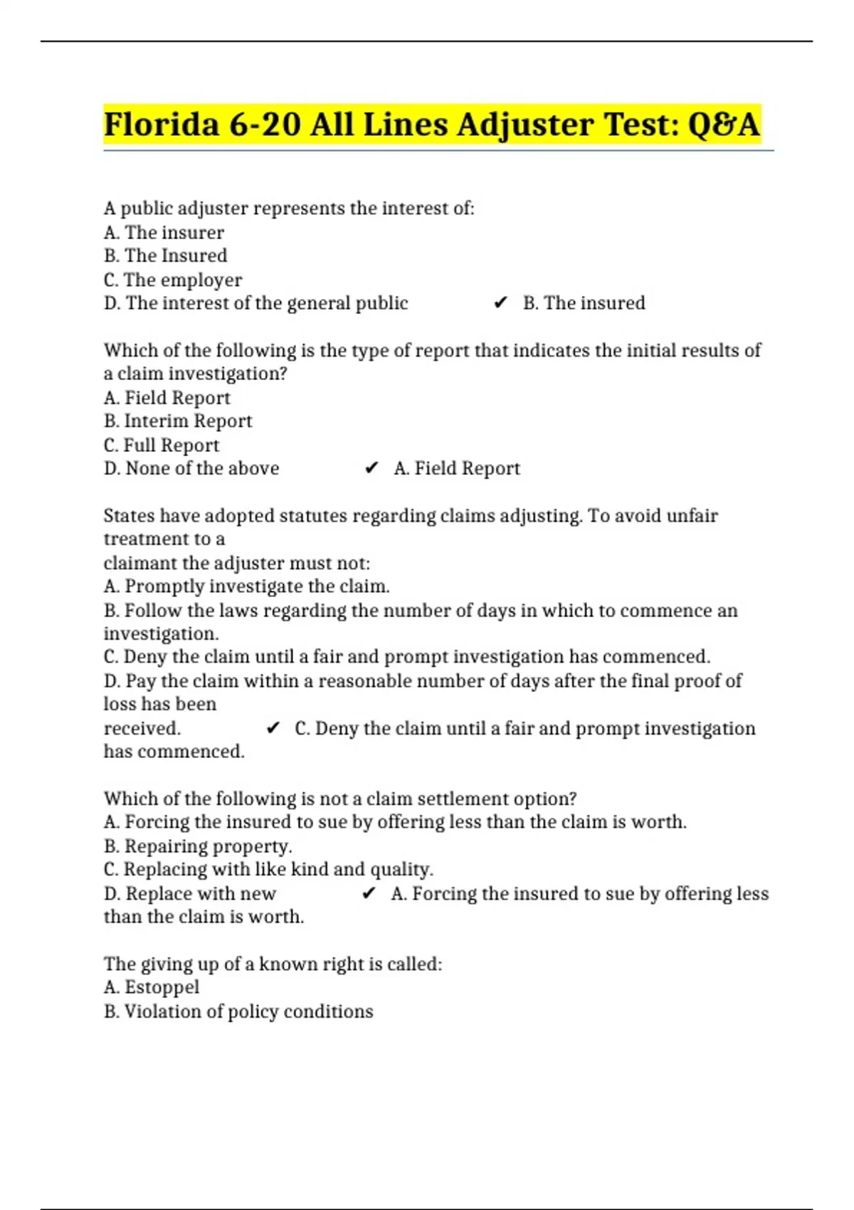 Florida 6-20 All Lines Adjuster Test: Q&A