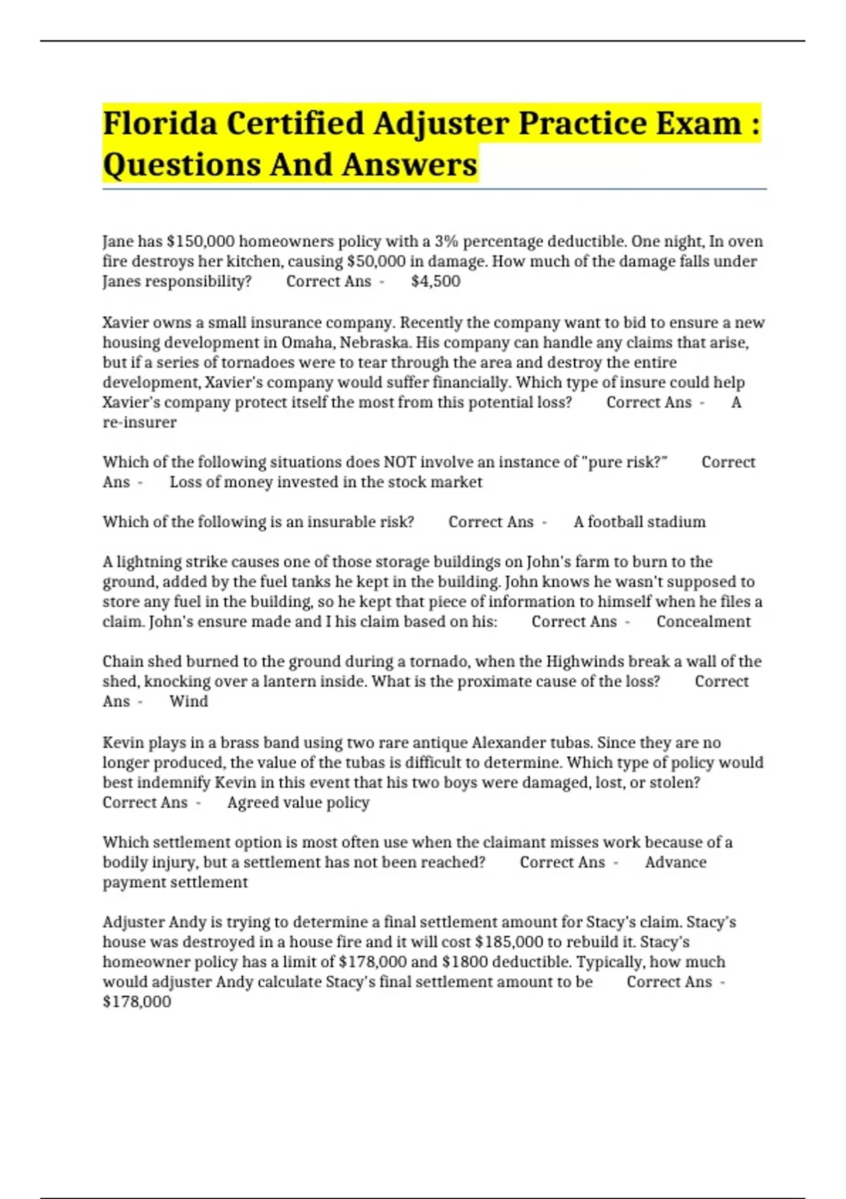 florida certified adjuster practice exam questions and answers