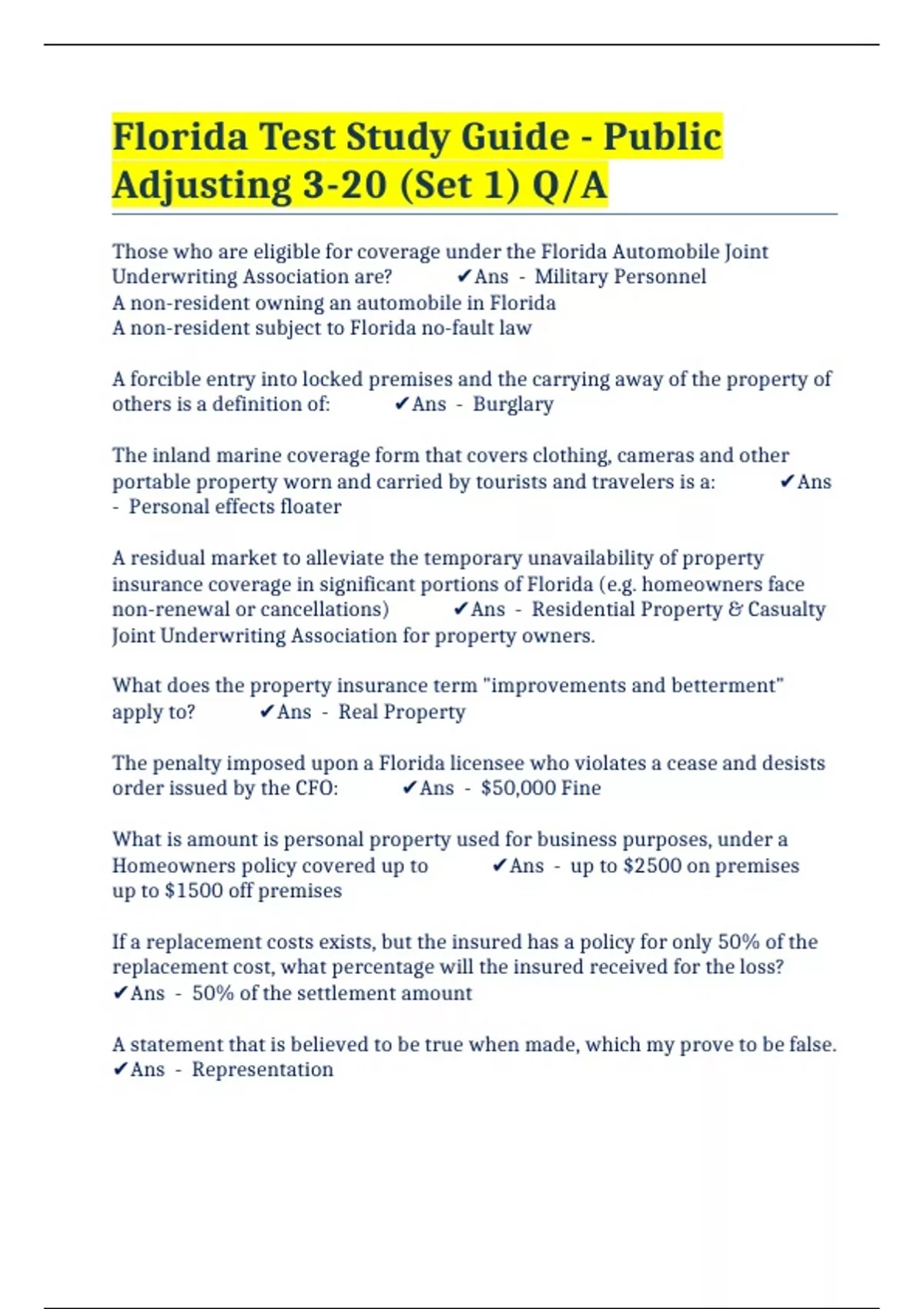 Florida Test Study Guide - Public Adjusting 3-20 (Set 1) Q/A