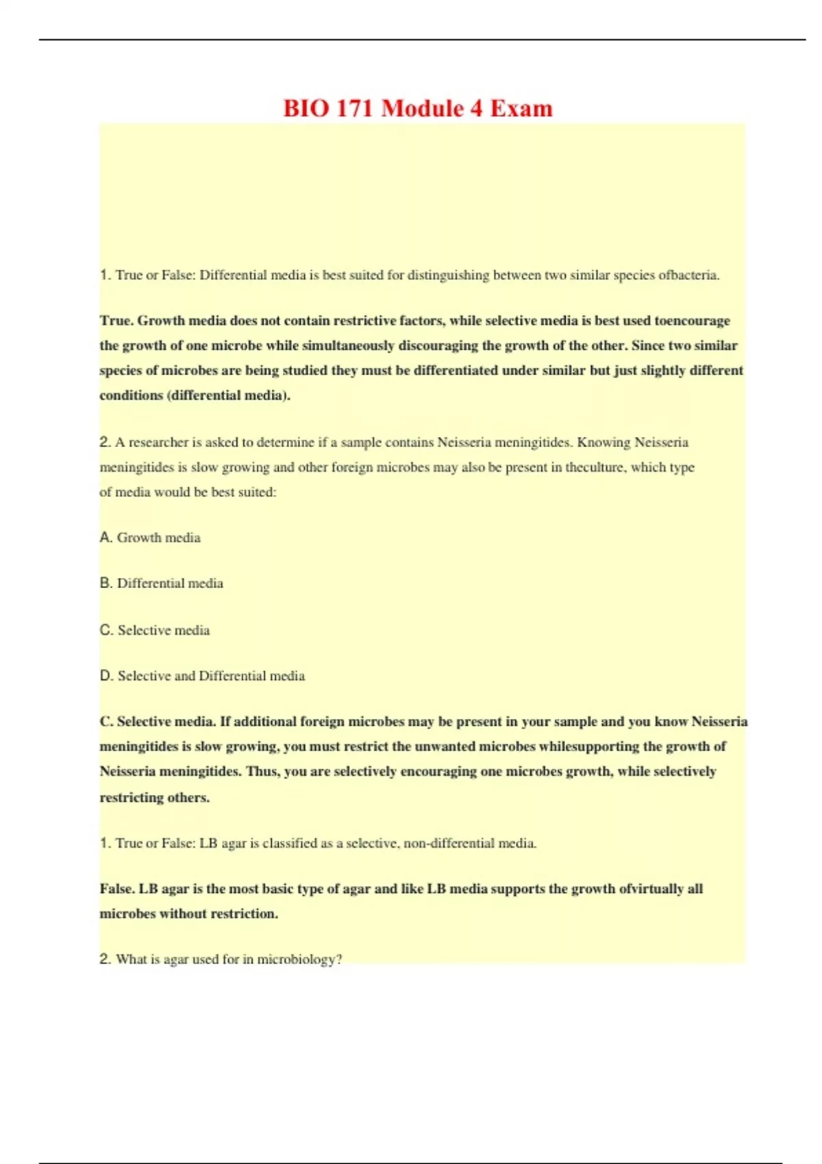 True or False: Differential media is best suited for distinguishing between two similar species ofbacteria. True. Growth media does not contain restrictive factors, while selective media is best used toencourage the growth of one microbe while simultaneously discouraging the growth of the other. Since two similar species of microbes are being studied they must be differentiated under similar but just slightly different conditions (differential media). 2. A researcher is asked to determine if a sample contains Neisseria meningitides. Knowing Neisseria meningitides is slow growing and other foreign microbes may also be present in theculture, which type of media would be best suited: A. Growth media B. Differential media C. Selective media D. Selective and Differential media C. Selective media. If additional foreign microbes may be present in your sample and you know Neisseria meningitides is slow growing, you must restrict the unwanted microbes whilesupporting the growth of Neisseria meningitides. Thus, you are selectively encouraging one microbes growth, while selectively restricting others. 1. True or False: LB agar is classified as a selective, non-differential media. False. LB agar is the most basic type of agar and like LB media supports the growth ofvirtually all microbes without restriction. 2. What is agar used for in microbiology? 1. Alpha hemolysis B A. No hemolytic activity 2. Beta hemolysis C B. Incomplete hemolytic activity 3. Gamma hemolysis A C. Complete hemolytic activity Agar is used to create a solid, smooth surface on which microbes can grow. 1. Match the following hemolytic class with its description of activity. 1. Columbia CNA agar is most closely related to which media: A. Trypticase Soy Agar B. MacConkey Agar C. Blood agar D. EMB agar C. CNA agar is similar to BAP as it is also enriched with blood and allows for differentiation based on hemolytic patterns. 2. True or False: Chocolate agar gets its brown color from cocoa to produce an enriched media. False. Chocolate (cocoa) is never added to the media. The name is derived simply based on the color that actually comes from the presence of ‘cooked’ (lysed) red blood cells in the media. 3. A researcher is studying a strain of E. coli currently growing on a MacConkey plate. However, the researcher can’t remember if E. coli is Gram-Positive or Gram-Negative. Would a Gram stain be necessary to confirm? Why or why not? No. A Gram stain would not be necessary, as only Gram-Negative microbes will grow on MacConkey agar. Thus, E. coli is a Gram-Negative microbe. 1. In an attempt to detect the presence of the pathogenic strain of E. coli O157:H7, a researcherspread a culture onto a MacConkey agar with failed results. What type of agar should they (correctly) try next? Why? They should try Sorbitol MacConkey agar which is a variant of MacConkey agar specifically formulated to detect the presence of the pathogenic strain E. coli O157:H7. SMAC plates containsorbitol instead of lactose in order to differentiate non- pathogenic (red colonies, acid conditions)strains from pathogenic O157:H7 strain (white colonies with neutral to basic conditions). 1. In Eosin Methylene Blue (EMB) agar, what color indicates the presence of E. coli? Metallic Green. 2. Which type of agar media is best suited to support the growth of Staphylococcus? A. MacConkey agar B. Blood agar C. Columbia CNA agar D. Mannitol salt agar E. Chocolate agar. D. Mannitol salt agar 1. What is the process of spreading a bacterial culture onto a petri dish? Plating. 2. In order to visual individual colonies of bacteria would you culture your sample in a liquid media or on a solid (agar) media? Why? Solid (agar) media. The primary advantage is that cells are held into place. When grown in a nutrient broth, bacterial cells can multiply but are free to move around in solution. When grown on agar within a petri dish the fixed in such as way as to form colonies. 3. True or False? The visualization of colonies on a petri dish represents bacterial cells that haveoften multiplied a million times ove
