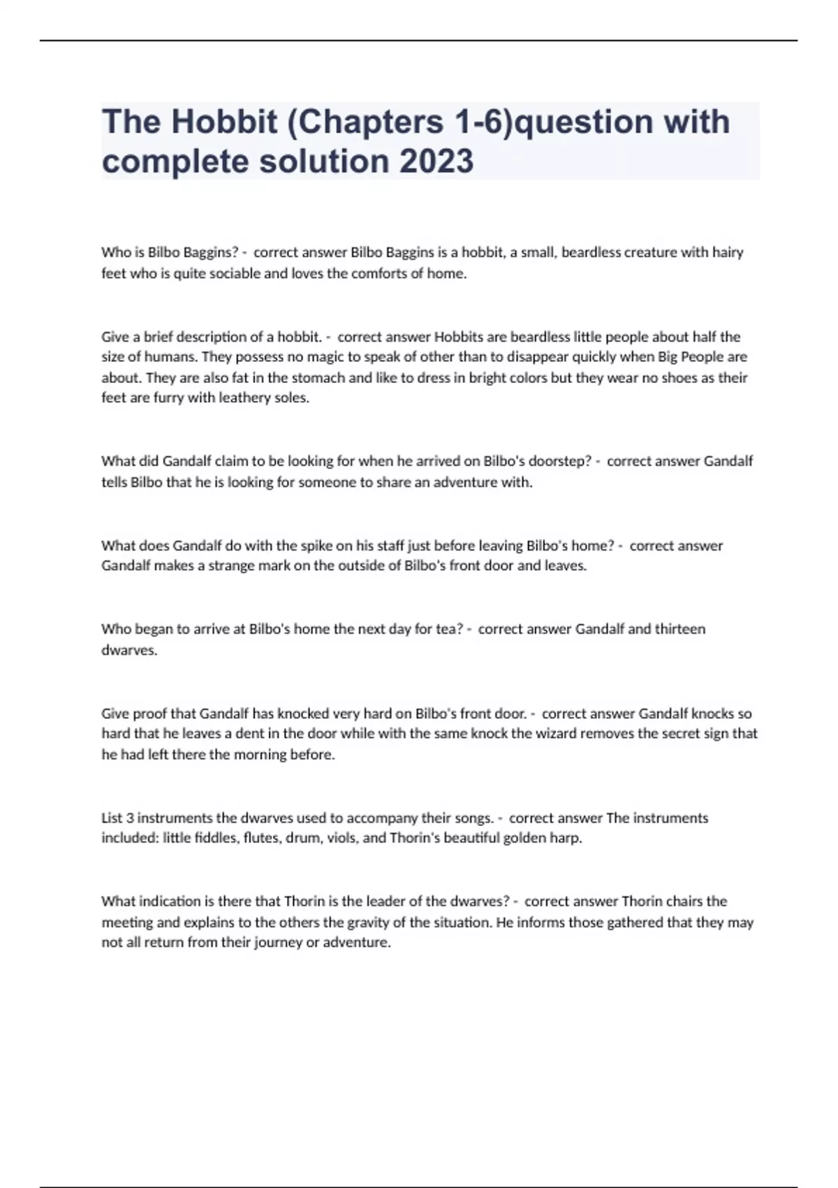 The Hobbit (Chapters 1-6)question with complete solution 2023Who is Bilbo Baggins? - correct answer Bilbo Baggins is a hobbit, a small, beardless creature with hairy feet who is quite sociable and loves the comforts of home. Give a brief description of a hobbit. - correct answer Hobbits are beardless little people about half the size of humans. They possess no magic to speak of other than to disappear quickly when Big People are about. They are also fat in the stomach and like to dress in bright colors but they wear no shoes as their feet are furry with leathery soles. What did Gandalf claim to be looking for when he arrived on Bilbo's doorstep? - correct answer Gandalf tells Bilbo that he is looking for someone to share an adventure with. What does Gandalf do with the spike on his staff just before leaving Bilbo's home? - correct answer Gandalf makes a strange mark on the outside of Bilbo's front door and leaves. Who began to arrive at Bilbo's home the next day for tea? - correct answer Gandalf and thirteen dwarves. Give proof that Gandalf has knocked very hard on Bilbo's front door. - correct answer Gandalf knocks so hard that he leaves a dent in the door while with the same knock the wizard removes the secret sign that he had left there the morning before. List 3 instruments the dwarves used to accompany their songs. - correct answer The instruments included: little fiddles, flutes, drum, viols, and Thorin's beautiful golden harp. What indication is there that Thorin is the leader of the dwarves? - correct answer Thorin chairs the meeting and explains to the others the gravity of the situation. He informs those gathered that they may not all return from their journey or adventure. Explain why Bilbo lets out a horrible shriek and begins to shake like jell