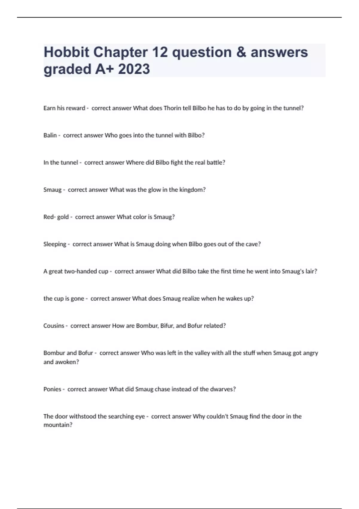 Hobbit Chapter 12 question & answers graded A+ 2023Earn his reward - correct answer What does Thorin tell Bilbo he has to do by going in the tunnel? Balin - correct answer Who goes into the tunnel with Bilbo? In the tunnel - correct answer Where did Bilbo fight the real battle? Smaug - correct answer What was the glow in the kingdom? Red- gold - correct answer What color is Smaug? Sleeping - correct answer What is Smaug doing when Bilbo goes out of the cave? A great two-handed cup - correct answer What did Bilbo take the first time he went into Smaug's lair? the cup is gone - correct answer What does Smaug realize when he wakes up? Cousins - correct answer How are Bombur, Bifur, and Bofur related? Bombur and Bofur - correct answer Who was left in the valley with all the stuff when Smaug got angry and awoken? Ponies - correct answer What did Smaug chase instead of the dwarves? The door withstood the searching eye - correct answer Why couldn't Smaug find the door in the mountain?