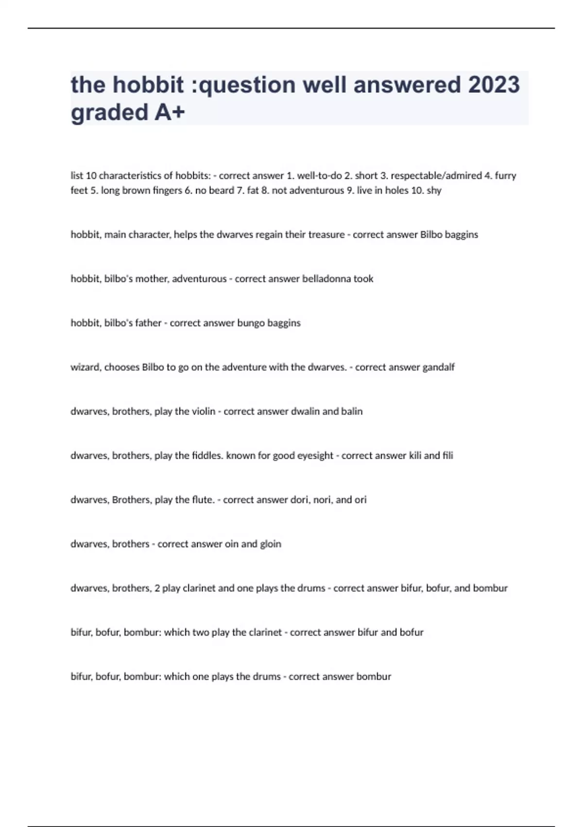 the hobbit :question well answered 2023 graded A+list 10 characteristics of hobbits: - correct answer 1. well-to-do 2. short 3. respectable/admired 4. furry feet 5. long brown fingers 6. no beard 7. fat 8. not adventurous 9. live in holes 10. shy hobbit, main character, helps the dwarves regain their treasure - correct answer Bilbo baggins hobbit, bilbo's mother, adventurous - correct answer belladonna took hobbit, bilbo's father - correct answer bungo baggins wizard, chooses Bilbo to go on the adventure with the dwarves. - correct answer gandalf dwarves, brothers, play the violin - correct answer dwalin and balin dwarves, brothers, play the fiddles. known for good eyesight - correct answer kili and fili dwarves, Brothers, play the flute. - correct answer dori, nori, and ori dwarves, brothers - correct answer oin and gloin dwarves, brothers, 2 play clarinet and one plays the drums - correct answer bifur, bofur, and bombur bifur, bofur, bombur: which two play the clarinet - correct answer bifur and bofur bifur, bofur, bombur: which one plays the drums - correct answer bombur