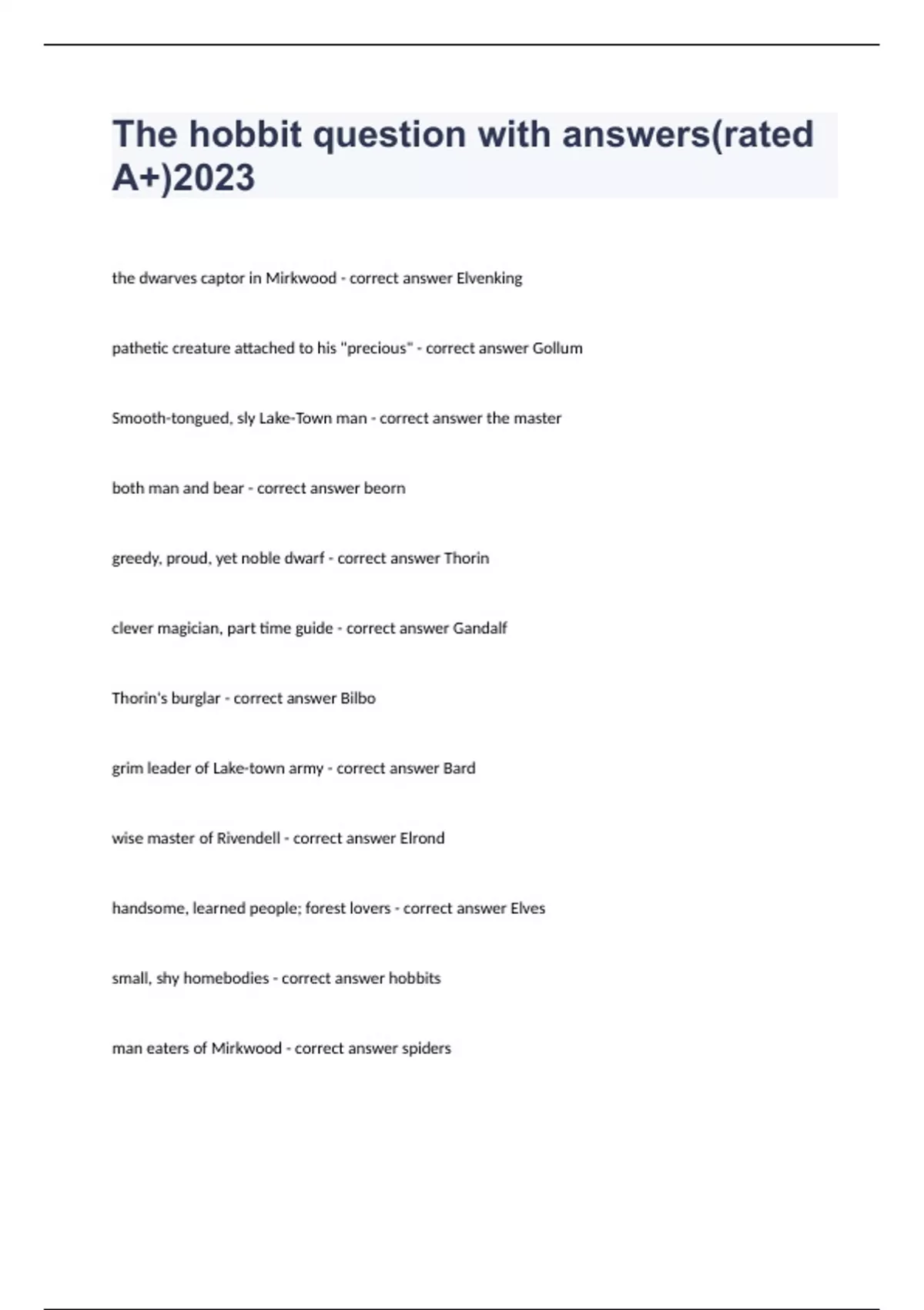 The hobbit question with answers(rated A+)2023the dwarves captor in Mirkwood - correct answer Elvenking pathetic creature attached to his "precious" - correct answer Gollum Smooth-tongued, sly Lake-Town man - correct answer the master both man and bear - correct answer beorn greedy, proud, yet noble dwarf - correct answer Thorin clever magician, part time guide - correct answer Gandalf Thorin's burglar - correct answer Bilbo grim leader of Lake-town army - correct answer Bard wise master of Rivendell - correct answer Elrond handsome, learned people; forest lovers - correct answer Elves small, shy homebodies - correct answer hobbits man eaters of Mirkwood - correct answer spiders