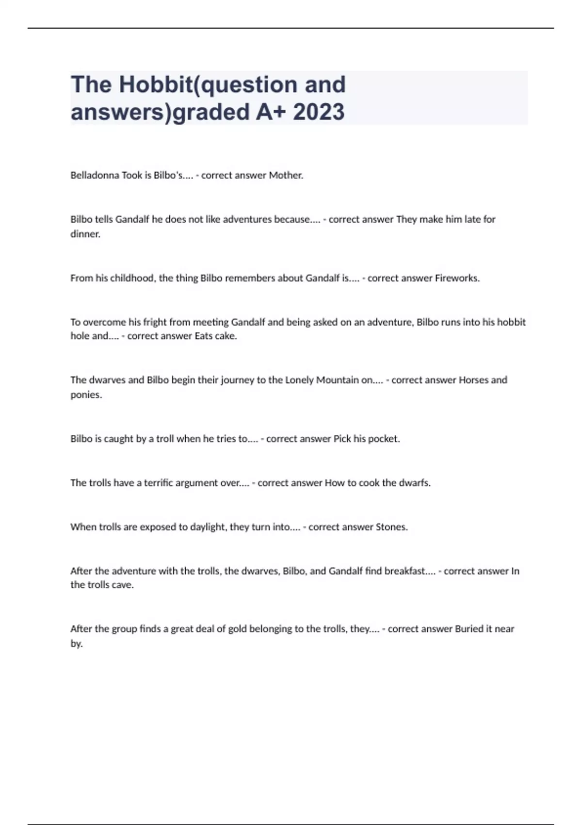 The Hobbit(question and answers)graded A+ 2023Belladonna Took is Bilbo's.... - correct answer Mother. Bilbo tells Gandalf he does not like adventures because.... - correct answer They make him late for dinner. From his childhood, the thing Bilbo remembers about Gandalf is.... - correct answer Fireworks. To overcome his fright from meeting Gandalf and being asked on an adventure, Bilbo runs into his hobbit hole and.... - correct answer Eats cake. The dwarves and Bilbo begin their journey to the Lonely Mountain on.... - correct answer Horses and ponies. Bilbo is caught by a troll when he tries to.... - correct answer Pick his pocket. The trolls have a terrific argument over.... - correct answer How to cook the dwarfs. When trolls are exposed to daylight, they turn into.... - correct answer Stones. After the adventure with the trolls, the dwarves, Bilbo, and Gandalf find breakfast.... - correct answer In the trolls cave. After the group finds a great deal of gold belonging to the trolls, they.... - correct answer Buried it near by.