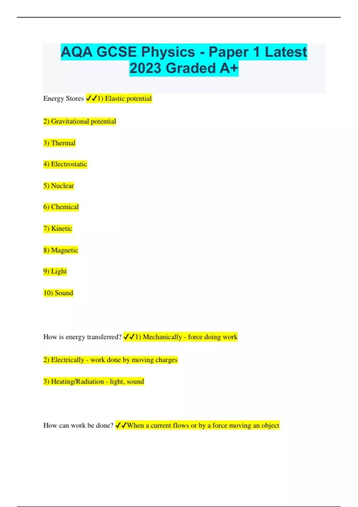 AQA GCSE Physics - Paper 1 Latest 2023 Graded A+ Energy Stores 1) Elastic potential 2) Gravitational potential 3) Thermal 4) Electrostatic 5) Nuclear 6) Chemical 7) Kinetic 8) Magnetic 9) Light 10) Sound How is energy transferred? 1) Mechanically - force doing work 2) Electrically - work done by moving charges 3) Heating/Radiation - light, sound How can work be done? When a current flows or by a force moving an object Kinetic energy formula E=1/2mv² Kinetic energy(J) = 0.5 x mass(kg) x speed²(m/s) Gravitational potential energy formula E=mgh G.P.E(J) = mass(kg) x gravitational field strength (N/kg) x height (m) What happens when an object falls and there's no air resistance? Energy lost from the g.p.e store = energy gained in the kinetic energy store What does air resistance do when acting against falling objects? It causes some energy to be transferred to other energy stores e.g. the thermal energy stores of the object and the surroundings Elastic potential energy formula E=1/2ke² E.P.E(J) = 0.5 x spring constant(N/m) x extension²(m) What is SHC? The amount of energy needed to raise the temperature of 1kg of a substance by 1°C SHC formula E=mcθ Change in thermal energy(J) = mass(kg) x SHC(J/kg/°C) x temperature change(°C) What is the conservation of energy principle? Energy can be transferred usefully, or stored or dissipated (wasted energy), but can never be created or destroyed What is power? The rate of energy transfer, or the rate of doing work What is 1W equal to? 1J of energy transferred per second Power Equation 1 E=Pt Energy transferred(J) = power(W) x time(s) Power Equation 2 W=Pt Work done