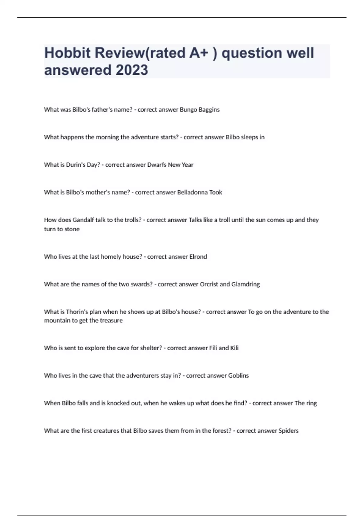 Hobbit Review(rated A+ ) question well answered 2023 What was Bilbo's father's name? - correct answer Bungo Baggins What happens the morning the adventure starts? - correct answer Bilbo sleeps in What is Durin's Day? - correct answer Dwarfs New Year What is Bilbo's mother's name? - correct answer Belladonna Took How does Gandalf talk to the trolls? - correct answer Talks like a troll until the sun comes up and they turn to stone Who lives at the last homely house? - correct answer Elrond What are the names of the two swards? - correct answer Orcrist and Glamdring What is Thorin's plan when he shows up at Bilbo's house? - correct answer To go on the adventure to the mountain to get the treasure Who is sent to explore the cave for shelter? - correct answer Fili and Kili Who lives in the cave that the adventurers stay in? - correct answer Goblins When Bilbo falls and is knocked out, when he wakes up what does he find? - correct answer The ring What are the first creatures that Bilbo saves them from in the forest? - correct answer Spiders