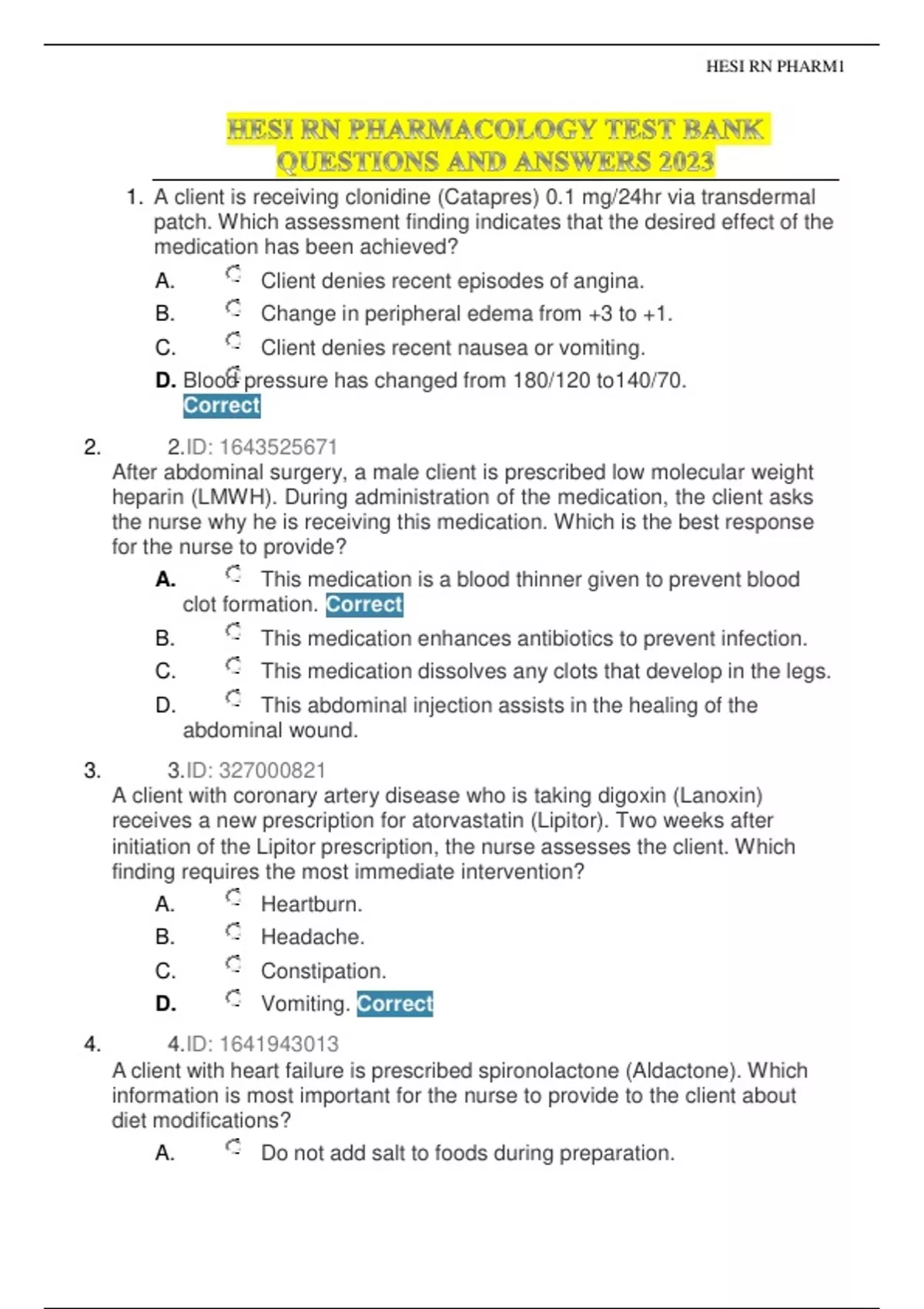 1. A client is receiving clonidine (Catapres) 0.1 mg/24hr via transdermal patch. Which assessment finding indicates that the desired effect of the medication has been achieved? A. Client denies recent episodes of angina. B. Change in peripheral edema from +3 to +1. C. Client denies recent nausea or vomiting. D. Blood pressure has changed from 180/120 to 140/70. Correct 2. 2.ID: 1 After abdominal surgery, a male client is prescribed low molecular weight heparin (LMWH). During administration of the medication, the client asks the nurse why he is receiving this medication. Which is the best response for the nurse to provide? A. This medication is a blood thinner given to prevent blood clot formation. Correct B. This medication enhances antibiotics to prevent infection. C. This medication dissolves any clots that develop in the legs. D. This abdominal injection assists in the healing of the abdominal wound. 3. 3.ID: A client with coronary artery disease who is taking digoxin (Lanoxin) receives a new prescription for atorvastatin (Lipitor). Two weeks after initiation of the Lipitor prescription, the nurse assesses the client. Which finding requires the most immediate intervention? A. Heartburn. B. Headache. C. Constipation. D. Vomiting. Correct 4. 4.ID: 3 A client with heart failure is prescribed spironolactone (Aldactone). Which information is most important for the nurse to provide to the client about diet modifications? A. Do not add salt to foods during preparation. B. Refrain for eating foods high in potassium. Correct C. Restrict fluid intake to 1000 ml per day. D. Increase intake of milk and milk products
