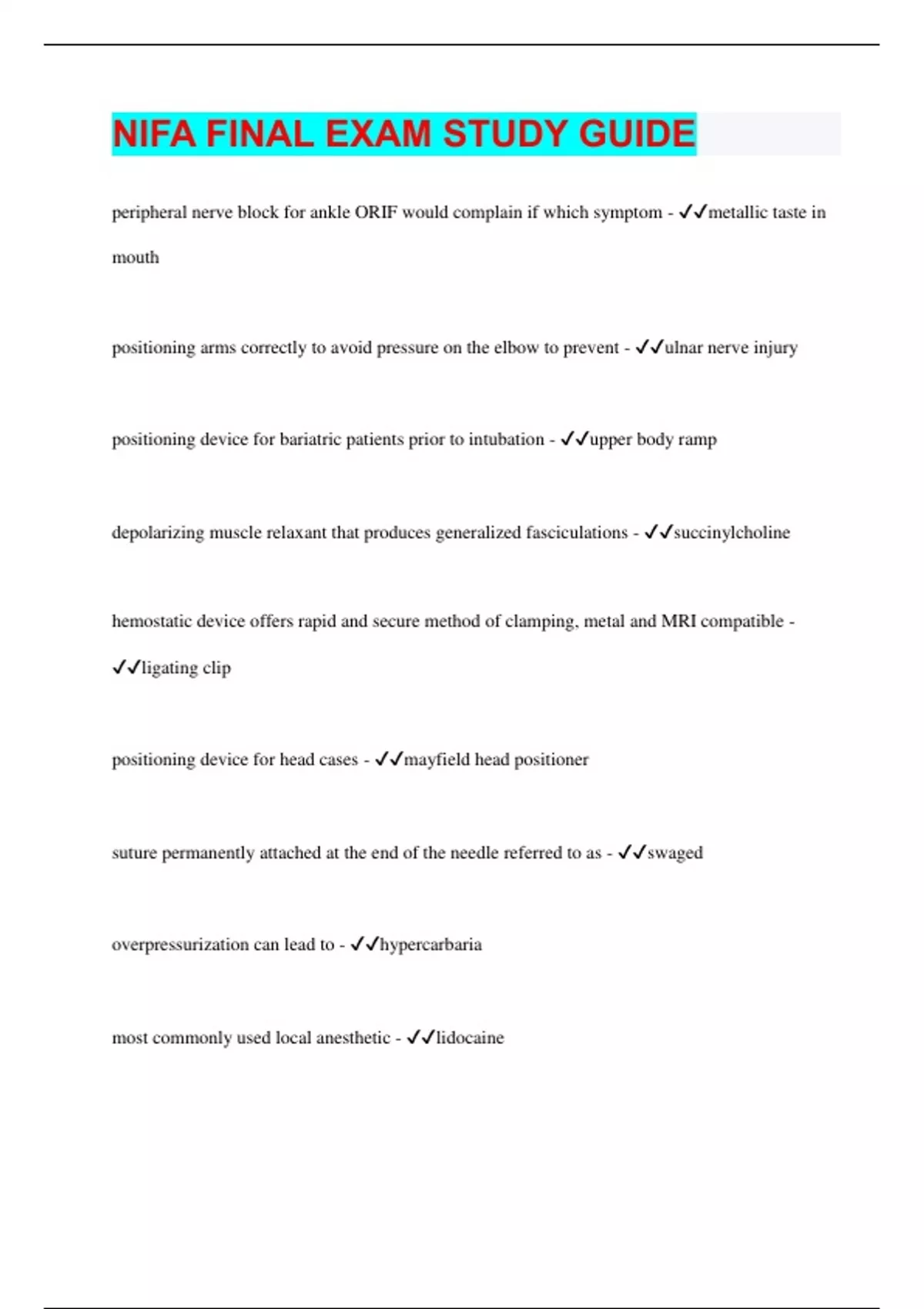 peripheral nerve block for ankle ORIF would complain if which symptom - metallic taste in mouth positioning arms correctly to avoid pressure on the elbow to prevent - ulnar nerve injury positioning device for bariatric patients prior to intubation - upper body ramp depolarizing muscle relaxant that produces generalized fasciculations - succinylcholine hemostatic device offers rapid and secure method of clamping, metal and MRI compatible - ligating clip positioning device for head cases - mayfield head positioner suture permanently attached at the end of the needle referred to as - swaged overpressurization can lead to - hypercarbaria most commonly