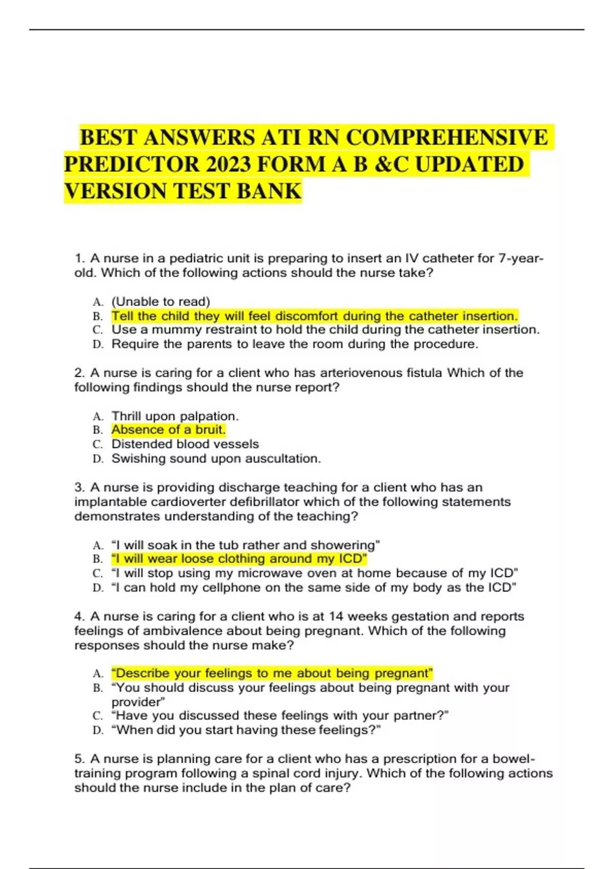 BEST ANSWERS ATI RN COMPREHENSIVE PREDICTOR 2023 FORM A B &C UPDATED VERSION TEST BANK