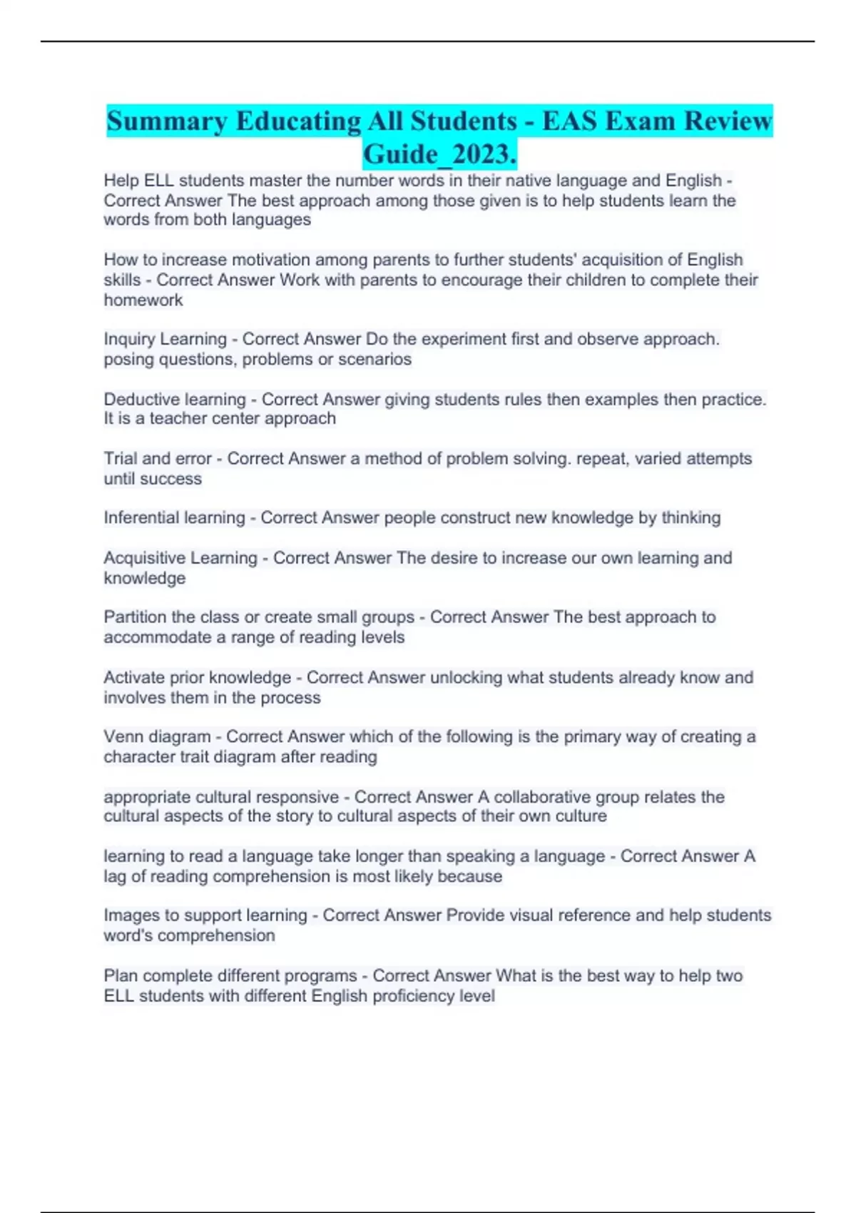 Summary Educating All Students - EAS Exam Review Guide_2023. Help ELL students master the number words in their native language and English - Correct Answer The best approach among those given is to help students learn the words from both languages How to increase motivation among parents to further students' acquisition of English skills - Correct Answer Work with parents to encourage their children to complete their homework Inquiry Learning - Correct Answer Do the experiment first and observe approach. posing questions, problems or scenarios Deductive learning - Correct Answer giving students rules then examples then practice. It is a teacher center approach Trial and error - Correct Answer a method of problem solving. repeat, varied attempts until success Inferential learning - Correct Answer people construct new knowledge by thinking Acquisitive Learning - Correct Answer The desire to increase our own learning and knowledge Partition the class or create small groups - Correct Answer The best approach to accommodate a range of reading levels Activate prior knowledge - Correct Answer unlocking what students already know and involves them in the process Venn diagram - Correct Answer which of the following is the primary way of creating a character trait diagram after reading appropriate cultural responsive - Correct Answer A collaborative group relates the cultural aspects of the story to cultural aspects of their own culture learning to read a language take longer than speaking a language - Correct Answer A lag of reading comprehension is most likely because Images to support learning - Correct Answer Provide visual reference and help students word's comprehension Plan complete different programs - Correct Answer What is the best way to help two ELL students with different English proficiency level
