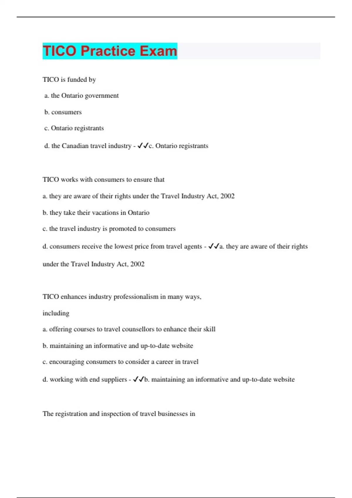 TICO is funded by a. the Ontario government b. consumers c. Ontario registrants d. the Canadian travel industry - c. Ontario registrants TICO works with consumers to ensure that a. they are aware of their rights under the Travel Industry Act, 2002 b. they take their vacations in Ontario c. the travel industry is promoted to consumers d. consumers receive the lowest price from travel agents - a. they are aware of their rights under the Travel Industry Act, 2002 TICO enhances industry professionalism in many ways, including a. offering courses to travel counsellors to enhance their skill b. maintaining an informative and up-to-date website c. encouraging consumers to consider a career in travel d. working with end suppliers - b. maintaining an informative and up-to-date website The registration and inspection of travel businesses inOntario is conducted by a. the federal government b. International Air Transport Association (IATA)