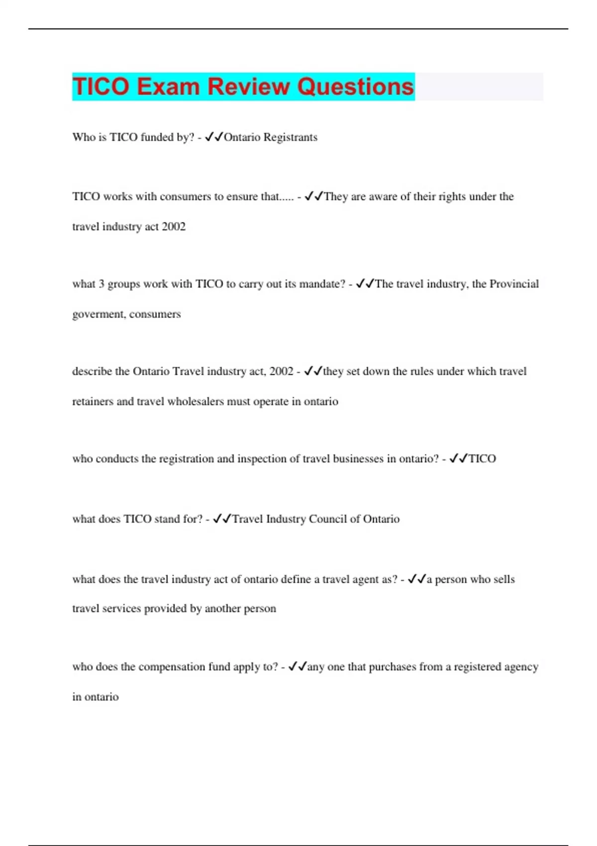 Who is TICO funded by? - Ontario Registrants TICO works with consumers to ensure that..... - They are aware of their rights under the travel industry act 2002 what 3 groups work with TICO to carry out its mandate? - The travel industry, the Provincial goverment, consumers describe the Ontario Travel industry act, 2002 - they set down the rules under which travel retainers and travel wholesalers must operate in ontario who conducts the registration and inspection of travel businesses in ontario? - TICO what does TICO stand for? - Travel Industry Council of Ontario what does the travel industry act of ontario define a travel agent as? - a person who sells travel services provided by another person who does the compensation fund apply to? - any one that purchases from a registered agency in ontario