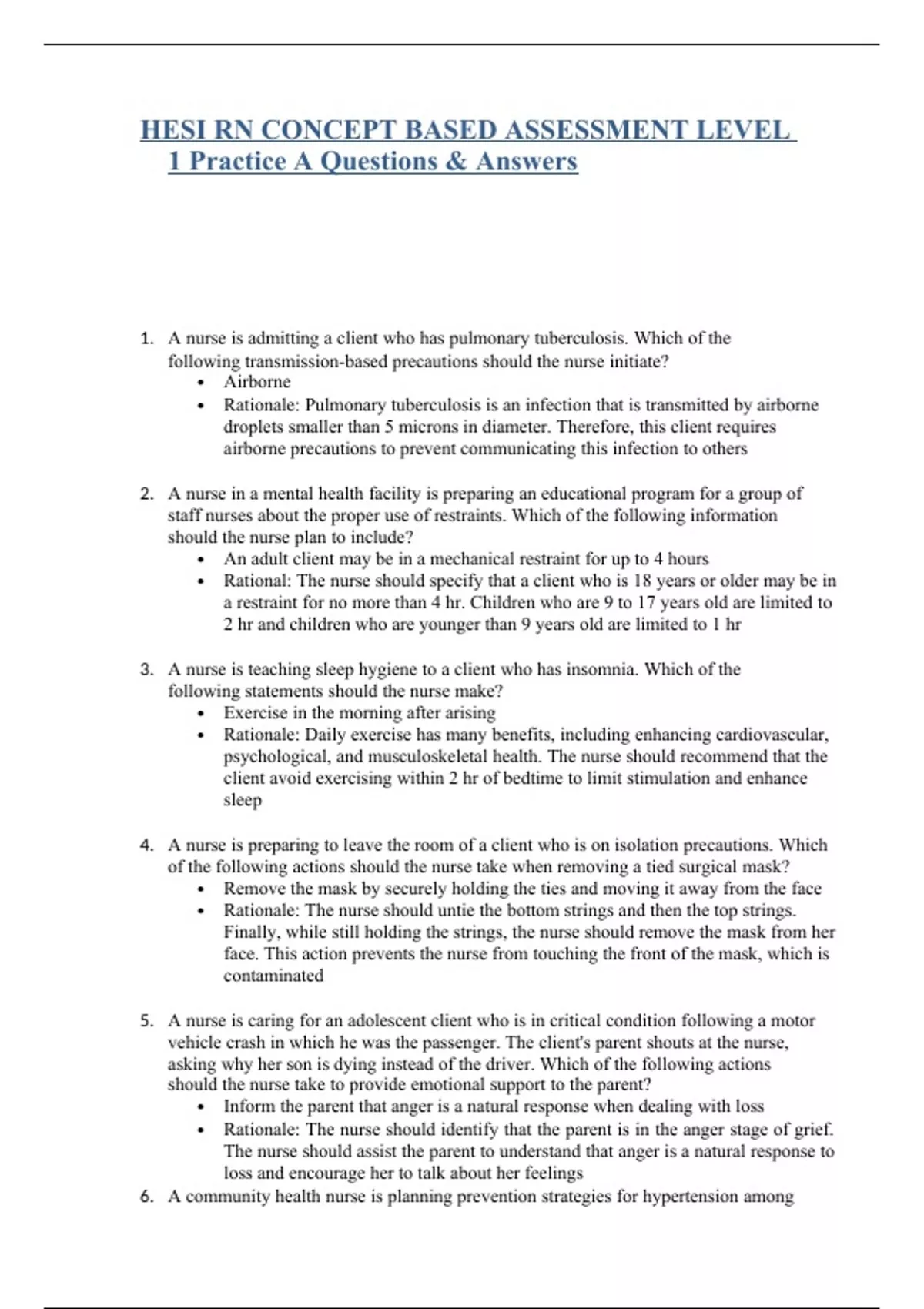 HESI RN CONCEPT BASED ASSESSMENT LEVEL 1 Practice A Questions & Answers 1. A nurse is admitting a client who has pulmonary tuberculosis. Which of the following transmission-based precautions should the nurse initiate? • Airborne • Rationale: Pulmonary tuberculosis is an infection that is transmitted by airborne droplets smaller than 5 microns in diameter. Therefore, this client requires airborne precautions to prevent communicating this infection to others 2. A nurse in a mental health facility is preparing an educational program for a group of staff nurses about the proper use of restraints. Which of the following information should the nurse plan to include? • An adult client may be in a mechanical restraint for up to 4 hours • Rational: The nurse should specify that a client who is 18 years or older may be in a restraint for no more than 4 hr. Children who are 9 to 17 years old are limited to 2 hr and children who are younger than 9 years old are limited to 1 hr 3. A nurse is teaching sleep hygiene to a client who has insomnia. Which of the following statements should the nurse make? • Exercise in the morning after arising • Rationale: Daily exercise has many benefits, including enhancing cardiovascular, psychological, and musculoskeletal health. The nurse should recommend that the client avoid exercising within 2 hr of bedtime to limit stimulation and enhance sleep 4. A nurse is preparing to leave the room of a client who is on isolation precautions. Which of the following actions should the nurse take when removing a tied surgical mask? • Remove the mask by securely holding the ties and moving it away from the face • Rationale: The nurse should untie the bottom strings and then the top strings. Finally, while still holding the strings, the nurse should remove the mask from her face. This action prevents the nurse from touching the front of the mask, which is contaminated 5. A nurse is caring for an adolescent client who is in critical condition following a motor vehicle crash in which he was the passenger. The client's parent shouts at the nurse, asking why her son is dying instead of the driver. Which of the following actions should the nurse take to provide emotional support to the parent? • Inform the parent that anger is a natural response when dealing with loss • Rationale: The nurse should identify that the parent is in the anger stage of grief. The nurse should assist the parent to understand that anger is a natural response to loss and encourage her to talk about her feelings 6. A community health nurse is planning prevention strategies for hypertension among members of her community. The nurse should identify that which of the following ethnic groups in the community is at greatest risk of developing hypertension? • African Americans • Rationale: Evidence-based practice indicates that individuals of African-American ethnicity have the highest prevalence of hypertension. Therefore, the nurse should identify community members of this ethnicity are at greatest risk of developing hypertension. 7. A community health nurse is planning interventions to promote Healthy People 2020 initiatives in the community. Which of the following actions should the nurse plan to take first? • Determine the level of health equity among groups in the community • Rationale: Health equity among all groups in the community is a Healthy People 2020 initiative. Using the nursing process, the first action the nurse should take is to assess the needs of the community. By identifying disparities in community health, the nurse can develop interventions targeted at the community's specific needs. 8. A nurse is reviewing a client's new prescriptions that were just documented in the client's medical record by the provider. Which of the following abbreviations should the nurse clarify with the provider? • Enoxaparin 40 mg SQ QD • Rationale: The nurse should clarify this prescription with the provider. The abbreviations "SQ" and "QD" are considered error-prone and should not be used in documentation. The nurse should clarify that the provider intends the prescription to be administered subcutaneously once daily. "Subcutaneous" or "subcut" should be used instead of "SQ" and "daily" should be used instead of "QD." 9. A nurse is talking with a client who has major depressive disorder. The client states, "Nobody cares if I'm around or not." Which of the following responses should the nurse take? • It sounds as though you’re feeling hopeless • Rationale: This statement by the nurse is an example of restating, which is a therapeutic response. This technique restates the main idea the client has expressed and allows the client to clarify any misunderstanding. 10. A nurse is preparing to administer a unit of packed RBCs to a client. In adherence with the Joint Commission National Patient Safety Goals regarding blood administration, which of the following actions should the nurse plan to take? • Verify the client and blood component using a two-person process • Rationale: The Joint Commission National Patient Safety Goals regarding blood transfusions includes improving the accuracy of client identification. The nurse should eliminate transfusion errors related to client misidentification by using a two-person verification process to identify the client and the blood component. 11. A nurse on a medical-surgical unit is caring for a group of clients. Which of the following clients should the nurse monitor for the development of reflex urinary incontinence? • A client who has a T12 spinal cord injury • Rationale: The nurse should identify that a client who has a C1 to S2 spinal cord injury is at risk of developing reflex urinary incontinence. With this type of incontinence, the client is unaware that the bladder is full and therefore lacks the urge to void, resulting in the involuntary loss of urine. The nurse should monitor for this form of incontinence and implement intervent