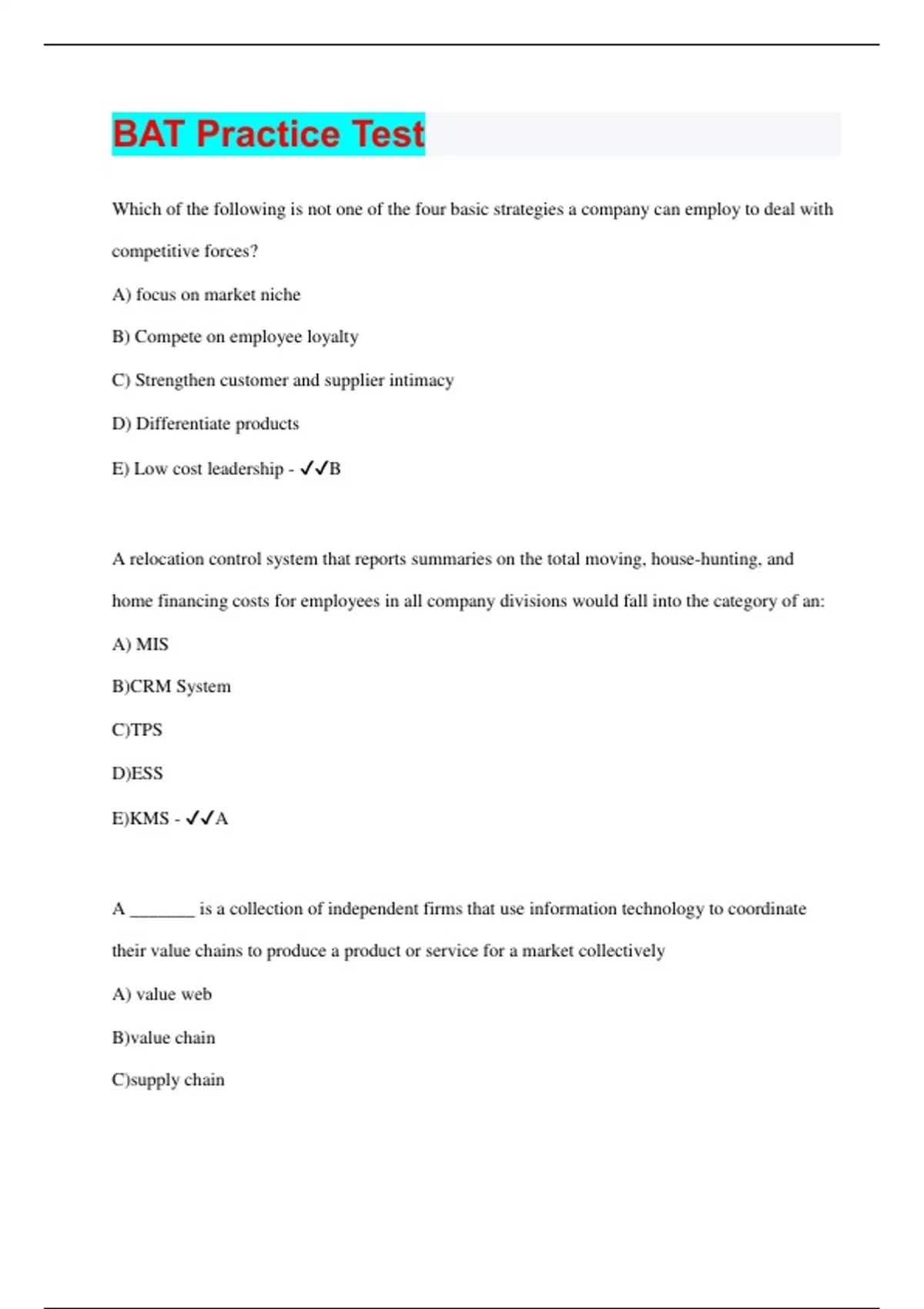 Which of the following is not one of the four basic strategies a company can employ to deal with competitive forces? A) focus on market niche B) Compete on employee loyalty C) Strengthen customer and supplier intimacy D) Differentiate products E) Low cost leadership - B A relocation control system that reports summaries on the total moving, house-hunting, and home financing costs for employees in all company divisions would fall into the category of an: A) MIS B)CRM System C)TPS D)ESS E)KMS - A A _______ is a collection of independent firms that use information technology to coordinate their value chains to produce a product or service for a market collectively A) value web B)value chain C)supply chain