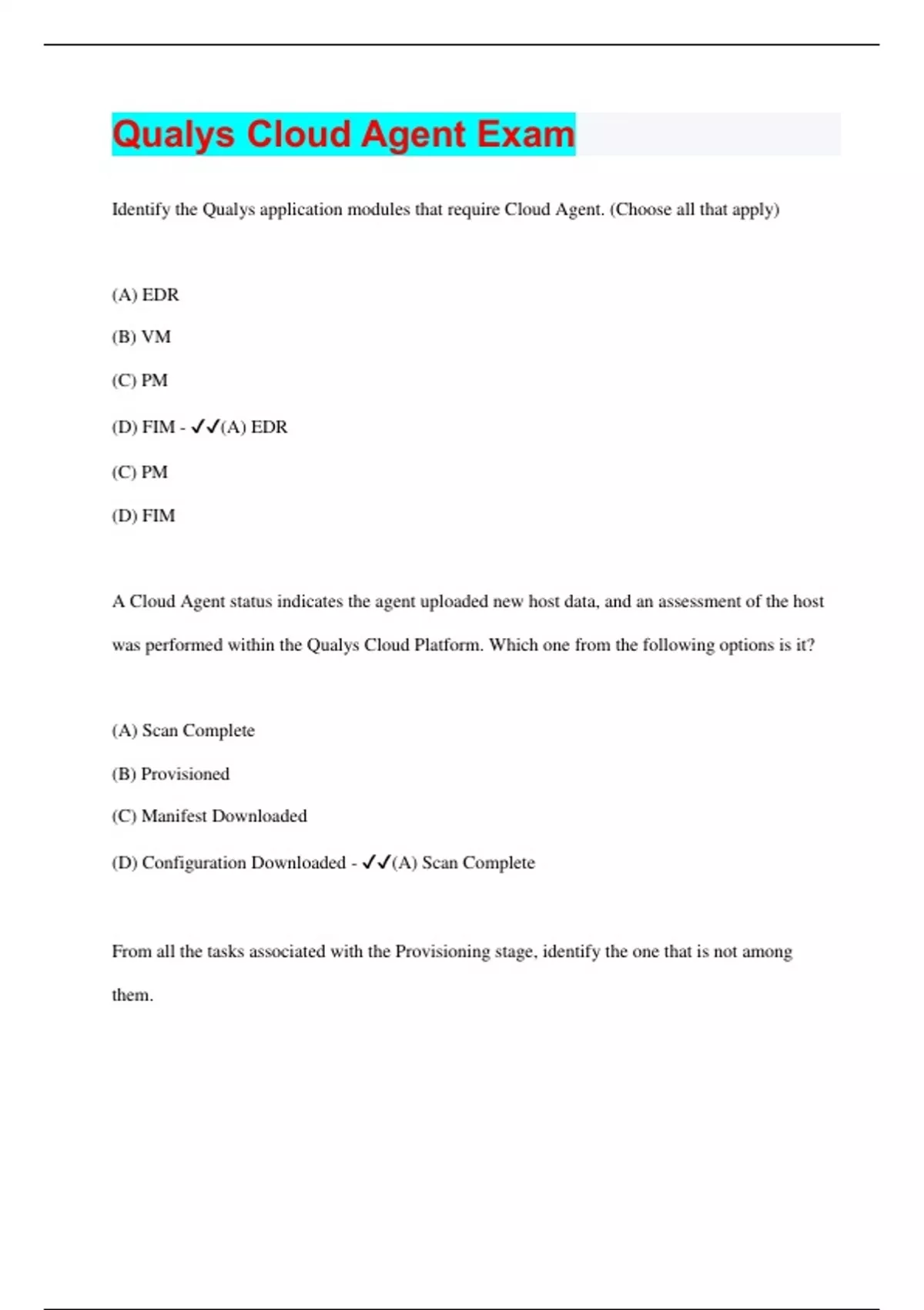 Identify the Qualys application modules that require Cloud Agent. (Choose all that apply) (A) EDR (B) VM (C) PM (D) FIM - (A) EDR (C) PM (D) FIM A Cloud Agent status indicates the agent uploaded new host data, and an assessment of the host was performed within the Qualys Cloud Platform. Which one from the following options is it? (A) Scan Complete (B) Provisioned (C) Manifest Downloaded (D) Configuration Downloaded - (A) Scan Complete From all the tasks associated with the Provisioning stage, identify the one that is not among them.