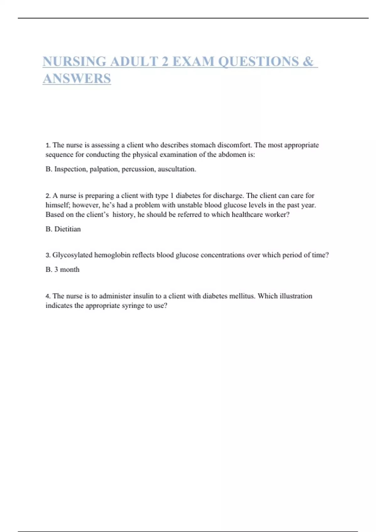 NURSING ADULT 2 EXAM QUESTIONS & ANSWERS 1. The nurse is assessing a client who describes stomach discomfort. The most appropriate sequence for conducting the physical examination of the abdomen is: B. Inspection, palpation, percussion, auscultation. 2. A nurse is preparing a client with type 1 diabetes for discharge. The client can care for himself; however, he’s had a problem with unstable blood glucose levels in the past year. Based on the client’s history, he should be referred to which healthcare worker? B. Dietitian 3. Glycosylated hemoglobin reflects blood glucose concentrations over which period of time? B. 3 month