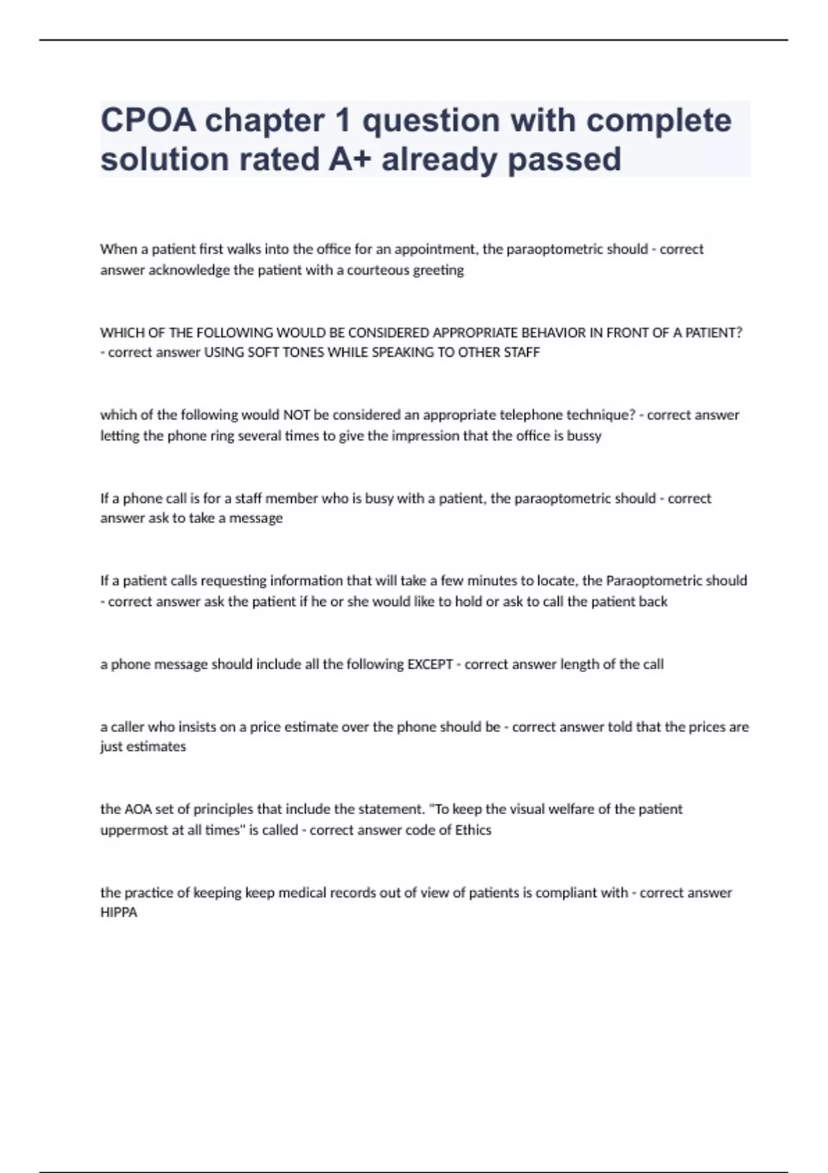 CPOA chapter 1 question with complete solution rated A+ already passedWhen a patient first walks into the office for an appointment, the paraoptometric should - correct answer acknowledge the patient with a courteous greeting WHICH OF THE FOLLOWING WOULD BE CONSIDERED APPROPRIATE BEHAVIOR IN FRONT OF A PATIENT? - correct answer USING SOFT TONES WHILE SPEAKING TO OTHER STAFF which of the following would NOT be considered an appropriate telephone technique? - correct answer letting the phone ring several times to give the impression that the office is bussy If a phone call is for a staff member who is busy with a patient, the paraoptometric should - correct answer ask to take a message If a patient calls requesting information that will take a few minutes to locate, the Paraoptometric should - correct answer ask the patient if he or she would like to hold or ask to call the patient back a phone message should include all the following EXCEPT - correct answer length of the call a caller who insists on a price estimate over the phone should be - correct answer told that the prices are just estimates the AOA set of principles that include the statement. "To keep the visual welfare of the patient uppermost at all times" is called - correct answer code of Ethics the practice of keeping keep medical records out of view of patients is compliant with - correct answer HIPPA