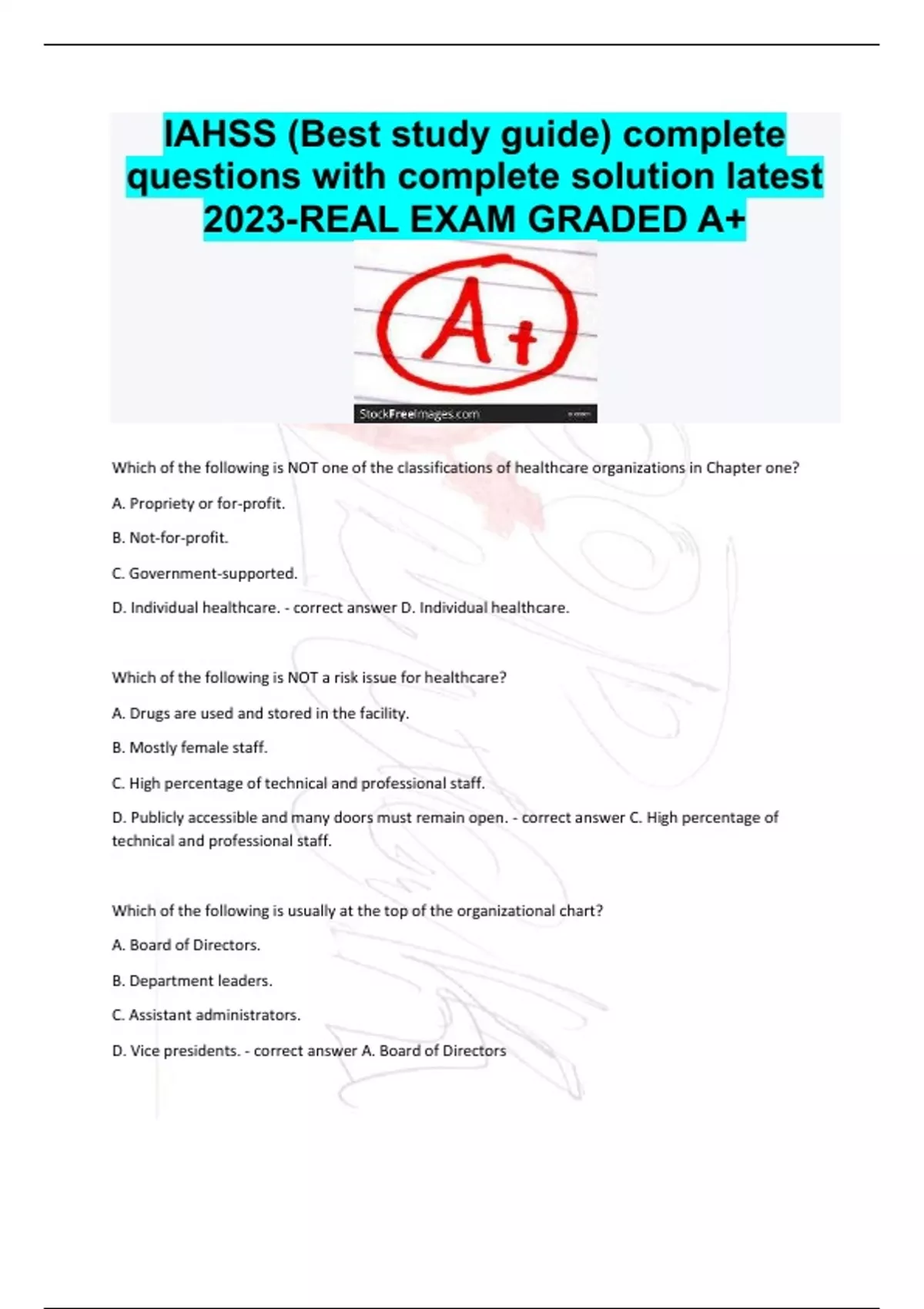 IAHSS (Best study guide) complete questions with complete solution latest 2023-REAL EXAM GRADED A+ Which of the following is NOT one of the classifications of healthcare organizations in Chapter one? A. Propriety or for-profit. B. Not-for-profit. C. Government-supported. D. Individual healthcare. - correct answer D. Individual healthcare. Which of the following is NOT a risk issue for healthcare? A. Drugs are used and stored in the facility. B. Mostly female staff. C. High percentage of technical and professional staff. D. Publicly accessible and many doors must remain open. - correct answer C. High percentage of technical and professional staff. Which of the following is usually at the top of the organizational chart? A. Board of Directors. B. Department leaders. C. Assistant administrators.