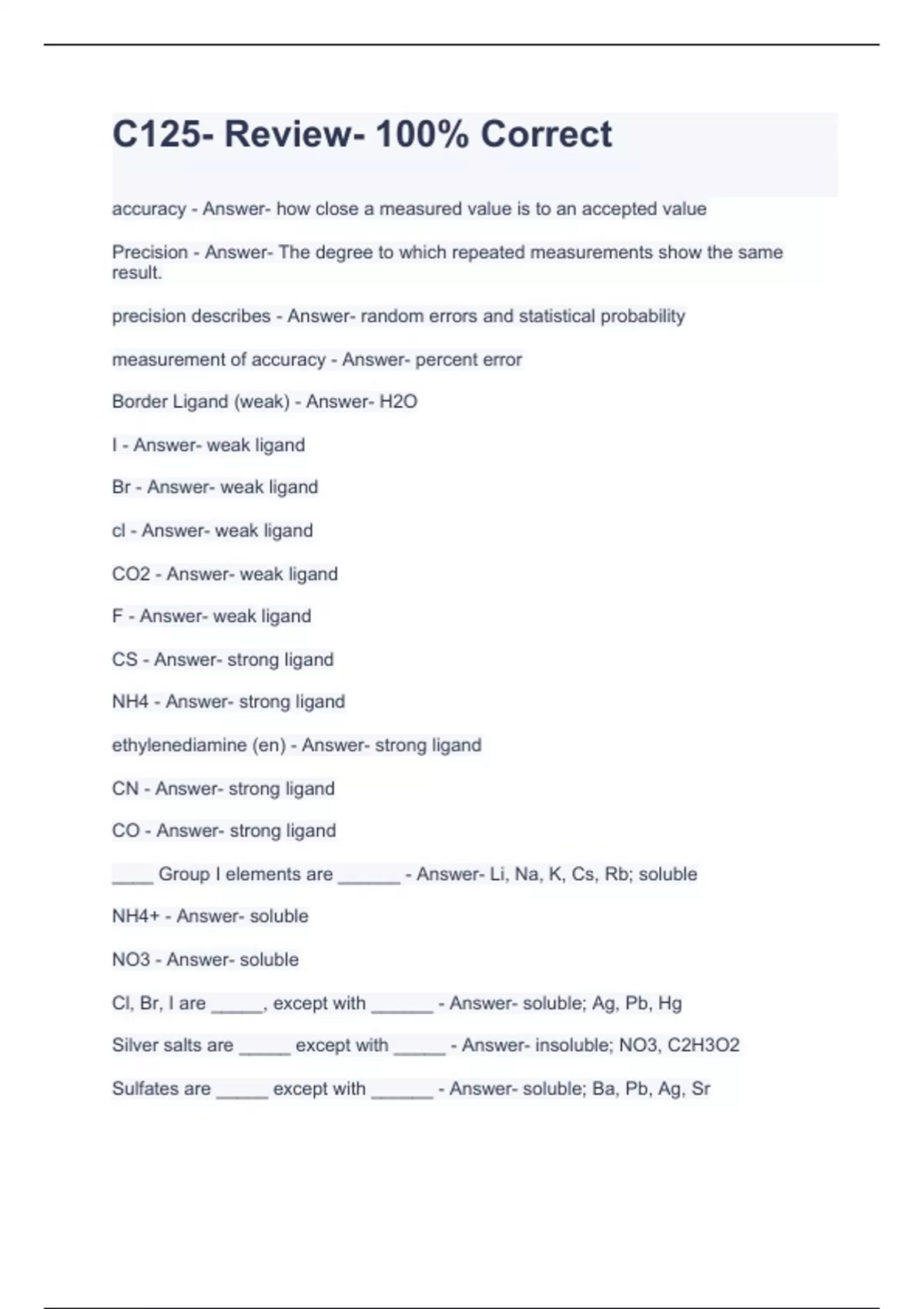 accuracy - Answer- how close a measured value is to an accepted value Precision - Answer- The degree to which repeated measurements show the same result. precision describes - Answer- random errors and statistical probability measurement of accuracy - Answer- percent error Border Ligand (weak) - Answer- H2O I - Answer- weak ligand Br - Answer- weak ligand cl - Answer- weak ligand CO2 - Answer- weak ligand F - Answer- weak ligand CS - Answer- strong ligand NH4 - Answer- strong ligand ethylenediamine (en) - Answer- strong ligand CN - Answer- strong ligand CO - Answer- strong ligand ____ Group I elements are ______ - Answer- Li, Na, K, Cs, Rb; soluble NH4+ - Answer- soluble NO3 - Answer- soluble Cl, Br, I are _____, except with ______ - Answer- soluble; Ag, Pb, Hg Silver salts are _____ except with _____ - Answer- insoluble; NO3, C2H3O2 Sulfates are _____ except with ______ - Answer- soluble; Ba, Pb, Ag, Sr Hydroxide salts are _____ except _____ - Answer- soluble; Ca, Sr, Ba Sulfides are - Answer- insoluble carbonates are - Answer- insoluble phosphates are - Answer- insoluble fluorides are - Answer- insoluble Avogadro's law states that: a) Equal amounts of gases occupy the same volume at constant temperature and pressure. b) The volume of a fixed amount of gas is inversely proportional to its pressure at constant temperature. c) The volume of a fixed amount of gas is directly proportional to its temperature in Kelvin at constant pressure. d) The total pressure of a mixture of gases is the simple sum of the partial pressure of all of the gaseous compounds. e) The rates of effusion of gases are inversely proportional to the square roots of their molar masses. - Answer- a Charles's law states that: a) Equal amounts of gases occupy the same volume at constant temperature and pressure. b) The volume of a fixed amount of gas is inversely proportional to its pressure at constant temperature. c) The volume of a fixed amount of gas is directly proportional to its temperature in Kelvin at constant pressure. d) The total pressure of a mixture of gases is the simple sum of the partial pressure of all of the gaseous compounds. e) The rates of effusion of gases are inversely proportional to the square roots of their molar masses. - Answer- c Boyle's law states that: a) Equal amounts of gases occupy the same volume at constant temperature and pressure. b) The volume of a fixed amount of gas is inversely proportional to its pressure at constant temperature. c) The volume of a fixed amount of gas is directly proportional to its temperature in Kelvin at constant pressure. d) The total pressure of a mixture of gases is the simple sum of the partial pressure of all of the gaseous compounds. e) The rates of effusion of gases are inversely proportional to the square roots of their molar masses. - Answer- b