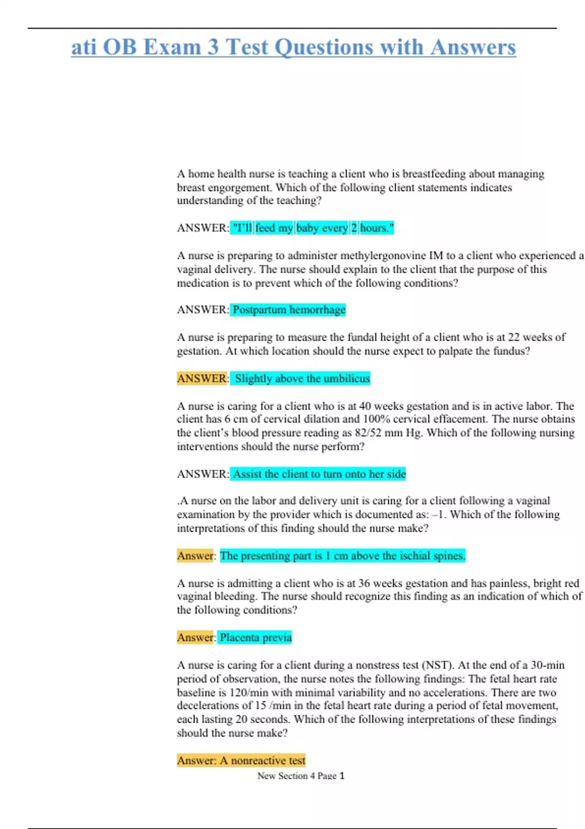 ati OB Exam 3 Test Questions with Answers A home health nurse is teaching a client who is breastfeeding about managing breast engorgement. Which of the following client statements indicates understanding of the teaching? ANSWER: "I’ll feed my baby every 2 hours." A nurse is preparing to administer methylergonovine IM to a client who experienced a vaginal delivery. The nurse should explain to the client that the purpose of this medication is to prevent which of the following conditions? ANSWER: Postpartum hemorrhage A nurse is preparing to measure the fundal height of a client who is at 22 weeks of gestation. At which location should the nurse expect to palpate the fundus? ANSWER: Slightly above the umbilicus A nurse is caring for a client who is at 40 weeks gestation and is in active labor. The client has 6 cm of cervical dilation and 100% cervical effacement. The nurse obtains the client’s blood pressure reading as 82/52 mm Hg. Which of the following nursing interventions should the nurse perform? ANSWER: Assist the client to turn onto her side .A nurse on the labor and delivery unit is caring for a client following a vaginal examination by the provider which is documented as: –1. Which of the following interpretations of this finding should the nurse make? Answer: The presenting part is 1 cm above the ischial spines. A nurse is admitting a client who is at 36 weeks gestation and has painless, bright red vaginal bleeding. The nurse should recognize this finding as an indication of which of the following conditions? Answer: Placenta previa A nurse is caring for a client during a nonstress test (NST). At the end of a 30-min period of observation, the nurse notes the following findings: The fetal heart rate baseline is 120/min with minimal variability and no accelerations. There are two decelerations of 15 /min in the fetal heart rate during a period of fetal movement, each lasting 20 seconds. Which of the following interpretations of these findings should the nurse make? Answer: A nonreactive test A nurse in a provider’s office is caring for a client who is at 36 weeks of gestation and scheduled for an amniocentesis. The client asks why she is having an ultrasound prior to the procedure. Which of the following is an appropriate response by the nurse? Answer: . "It assists in identifying the location of the placenta and fetus." A nurse is caring for a client who is 6 hr postpartum. The client is Rh-negative and her newborn is Rh-positive. The client asks why an indirect Coombs test was ordered by the provider. Which of the following is an appropriate response by the nurse? ANSWER: "It detects Rh-positive antibodies in the mother’s blood." A nurse is caring for a client who is 12 hr postpartum following a vaginal delivery. Which of the following findings should the nurse expect? ANSWER: . Fundus firm, at the level of the umbilicus A nurse is caring for a client who is postpartum and finds the fundus slightly boggy and displaced to the right. Based on these findings, which of the following actions should the nurse take? ANSWER: Assist the client to the bathroom to void A nurse is caring for a client who is 5 hr postpartum following a vaginal birth of a newborn weighing 9 lb 6 oz. (4252 g). The nurse should recognize that this client is at risk for which of the following postpartum complications? ANSWER: Uterine atony A nurse is caring for a client who is 4 hr postpartum following a vaginal birth. The client has saturated a perineal pad within 10 min. Which of the following actions should the nurse take first? ANSWER: Massage the client's fundus. A nurse on the obstetric unit is caring for a client who experienced abruptio placentae. The nurse observes petechiae and bleeding around the IV access site. The nurse should recognize that this client is at risk for which of the following complications? ANSWER: Disseminated intravascular coagulation A nurse midwife is examining a client who is a primigravida at 42 weeks of gestation and states that she believes she is in labor. Which of the following findings confirm to the nurse that the client is in labor? ANSWER: Cervical dilation A nurse is caring for a client 2 hr after a spontaneous vaginal birth and the client has saturated two perineal pads with blood in a 30-min period. Which of the following is the priority nursing intervention at this time? ANSWER: Palpate the client’s uterine fundus. A nurse in a prenatal clinic is caring for a client who is at 38 weeks of gestation and undergoing a contraction stress test. The test results are negative. Which of the following interpretations of this finding should the nurse make? ANSWER: . There is no evidence of uteroplacental insufficiency.