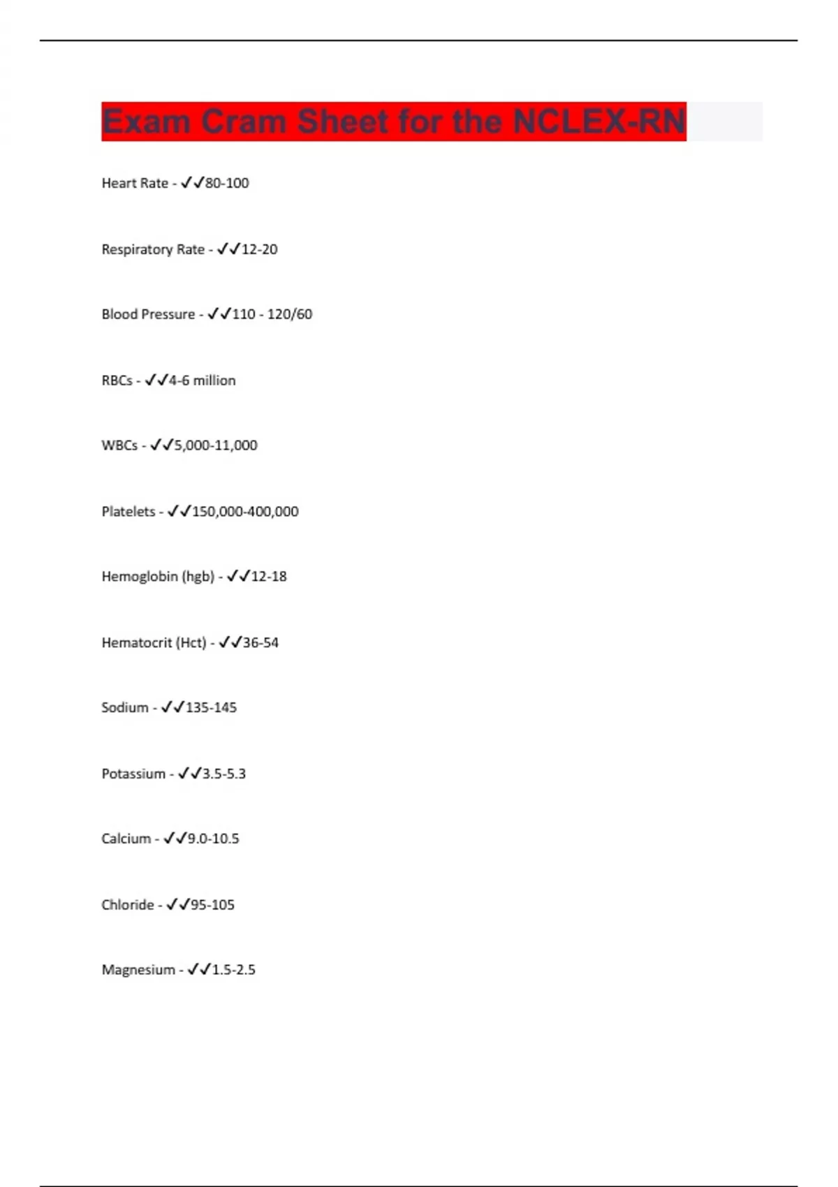 Heart Rate - 80-100 Respiratory Rate - 12-20 Blood Pressure - 110 - 120/60 RBCs - 4-6 million WBCs - 5,000-11,000 Platelets - 150,000-400,000 Hemoglobin (hgb) - 12-18 Hematocrit (Hct) - 36-54 Sodium - 135-145 Potassium - 3.5-5.3 Calcium - 9.0-10.5 Chloride - 95-105 Magnesium - 1.5-2.5