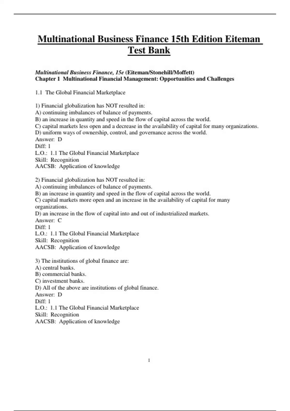 Multinational Business Finance 15th Edition Eiteman Test Bank Complete Test Bank Multinational Business Finance 15th Edition Eiteman Questions & Answers with rationales (Chapter 1-18) PDF File All Pages All Chapters Grade A+