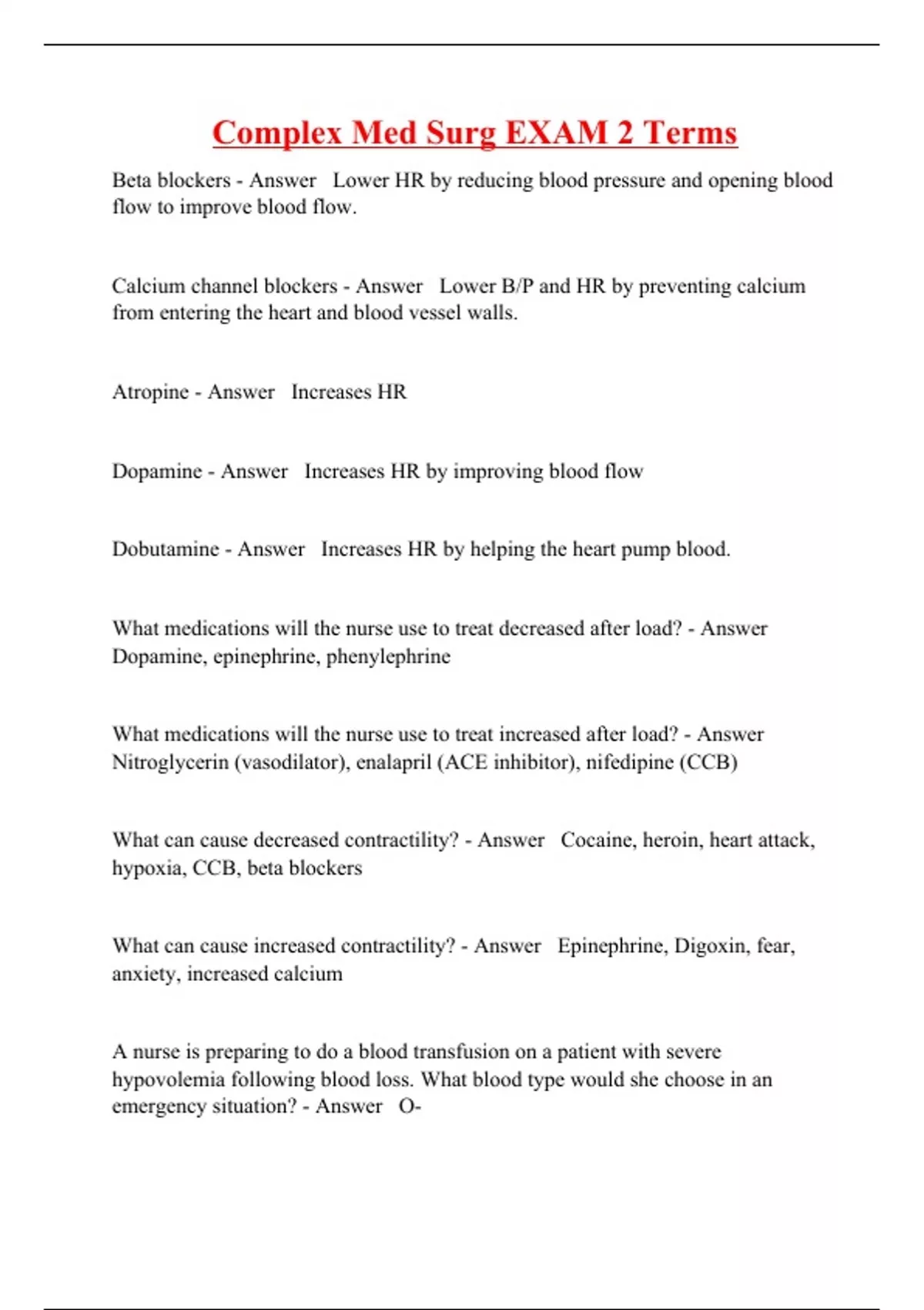 Beta blockers - Answer Lower HR by reducing blood pressure and opening blood flow to improve blood flow. Calcium channel blockers - Answer Lower B/P and HR by preventing calcium from entering the heart and blood vessel walls. Atropine - Answer Increases HR Dopamine - Answer Increases HR by improving blood flow Dobutamine - Answer Increases HR by helping the heart pump blood. What medications will the nurse use to treat decreased after load? - Answer Dopamine, epinephrine, phenylephrine What medications will the nurse use to treat increased after load? - Answer Nitroglycerin (vasodilator), enalapril (ACE inhibitor), nifedipine (CCB) What can cause decreased contractility? - Answer Cocaine, heroin, heart attack, hypoxia, CCB, beta blockers What can cause increased contractility? - Answer Epinephrine, Digoxin, fear, anxiety, increased calcium
