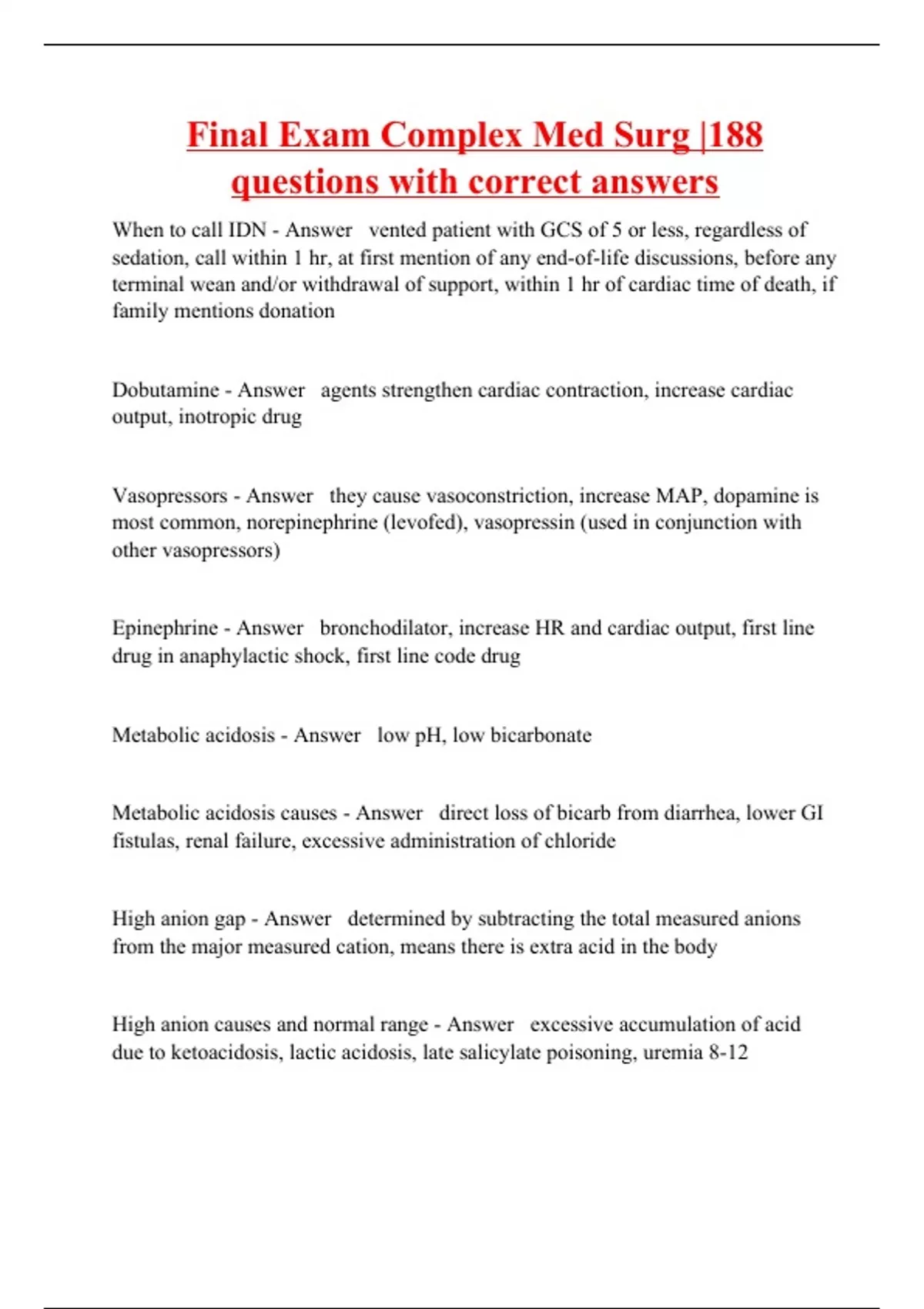 When to call IDN - Answer vented patient with GCS of 5 or less, regardless of sedation, call within 1 hr, at first mention of any end-of-life discussions, before any terminal wean and/or withdrawal of support, within 1 hr of cardiac time of death, if family mentions donation Dobutamine - Answer agents strengthen cardiac contraction, increase cardiac output, inotropic drug Vasopressors - Answer they cause vasoconstriction, increase MAP, dopamine is most common, norepinephrine (levofed), vasopressin (used in conjunction with other vasopressors) Epinephrine - Answer bronchodilator, increase HR and cardiac output, first line drug in anaphylactic shock, first line code drug Metabolic acidosis - Answer low pH, low bicarbonate Metabolic acidosis causes - Answer direct loss of bicarb from diarrhea, lower GI fistulas, renal failure, excessive administration of chloride High anion gap - Answer determined by subtracting the total measured anions from the major measured cation, means there is extra acid in the body High anion causes and normal range - Answer excessive accumulation of acid due to ketoacidosis, lactic acidosis, late salicylate poisoning, uremia 8-12