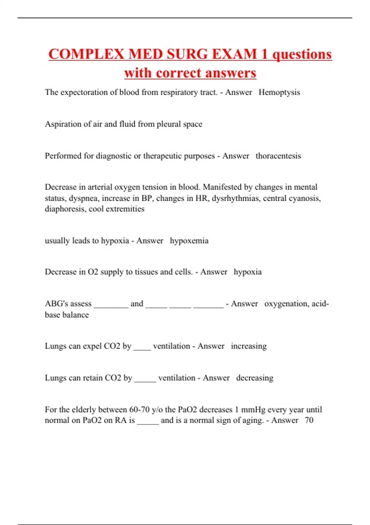 The expectoration of blood from respiratory tract. - Answer Hemoptysis Aspiration of air and fluid from pleural space Performed for diagnostic or therapeutic purposes - Answer thoracentesis Decrease in arterial oxygen tension in blood. Manifested by changes in mental status, dyspnea, increase in BP, changes in HR, dysrhythmias, central cyanosis, diaphoresis, cool extremities usually leads to hypoxia - Answer hypoxemia Decrease in O2 supply to tissues and cells. - Answer hypoxia ABG's assess ________ and _____ _____ _______ - Answer oxygenation, acid-base balance Lungs can expel CO2 by ____ ventilation - Answer increasing Lungs can retain CO2 by _____ ventilation - Answer decreasing For the elderly between 60-70 y/o the PaO2 decreases 1 mmHg every year until normal on PaO2 on RA is _____ and is a normal sign of aging. - Answer 70