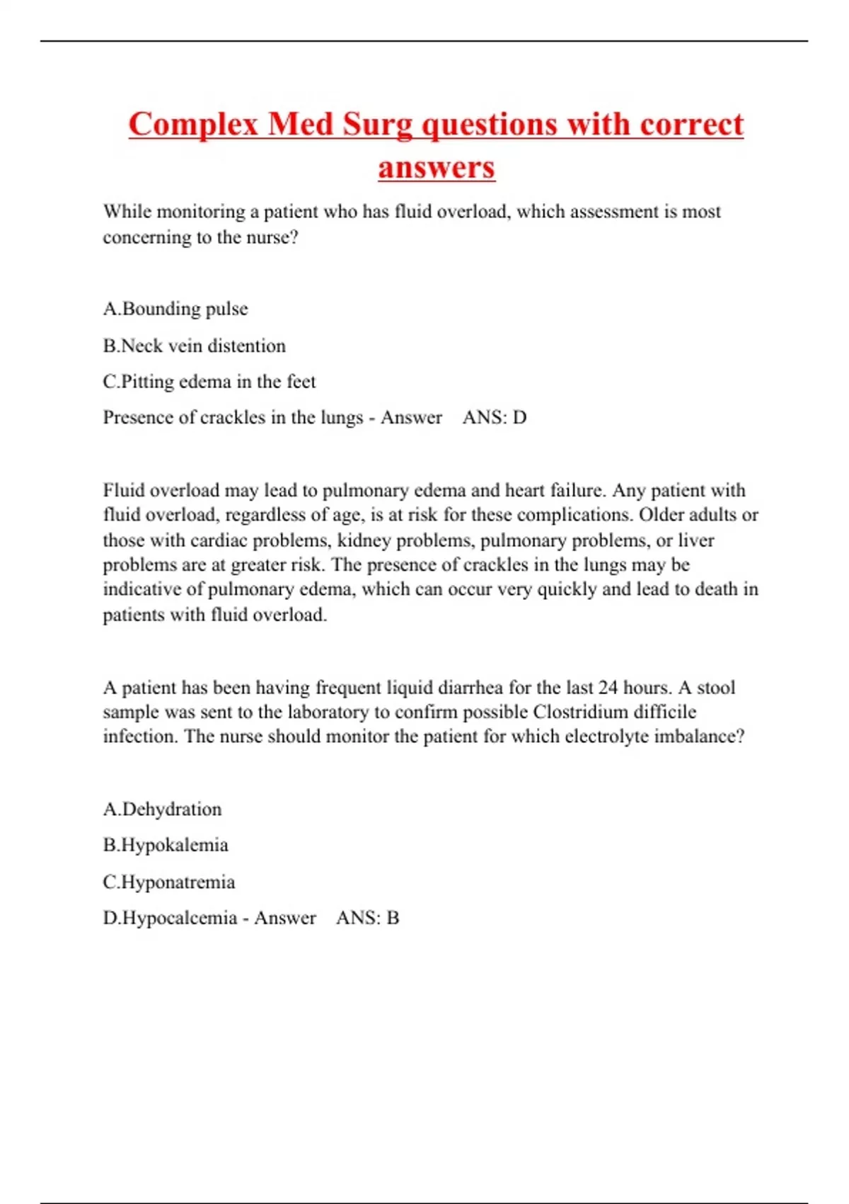 While monitoring a patient who has fluid overload, which assessment is most concerning to the nurse? A.Bounding pulse B.Neck vein distention C.Pitting edema in the feet Presence of crackles in the lungs - Answer ANS: D Fluid overload may lead to pulmonary edema and heart failure. Any patient with fluid overload, regardless of age, is at risk for these complications. Older adults or those with cardiac problems, kidney problems, pulmonary problems, or liver problems are at greater risk. The presence of crackles in the lungs may be indicative of pulmonary edema, which can occur very quickly and lead to death in patients with fluid overload. A patient has been having frequent liquid diarrhea for the last 24 hours. A stool sample was sent to the laboratory to confirm possible Clostridium difficile infection. The nurse should monitor the patient for which electrolyte imbalance? A.Dehydration B.Hypokalemia C.Hyponatremia D.Hypocalcemia - Answer ANS: B Potassium re-absorption primarily occurs t
