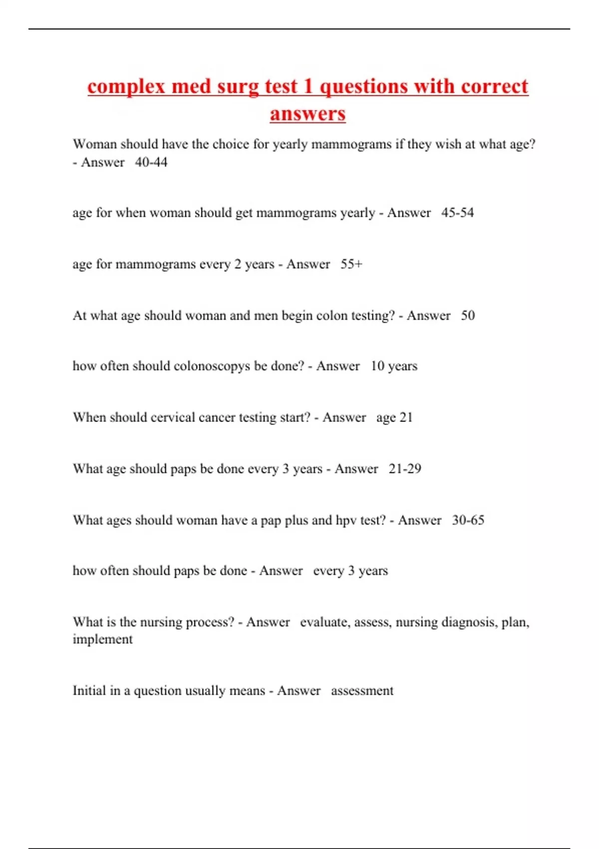 Woman should have the choice for yearly mammograms if they wish at what age? - Answer 40-44 age for when woman should get mammograms yearly - Answer 45-54 age for mammograms every 2 years - Answer 55+ At what age should woman and men begin colon testing? - Answer 50 how often should colonoscopys be done? - Answer 10 years When should cervical cancer testing start? - Answer age 21 What age should paps be done every 3 years - Answer 21-29 What ages should woman have a pap plus and hpv test? - Answer 30-65 how often should paps be done - Answer every 3 years What is the nursing process? - Answer evaluate, assess, nursing diagnosis, plan, implement Initial in a question usually means - Answer assessment