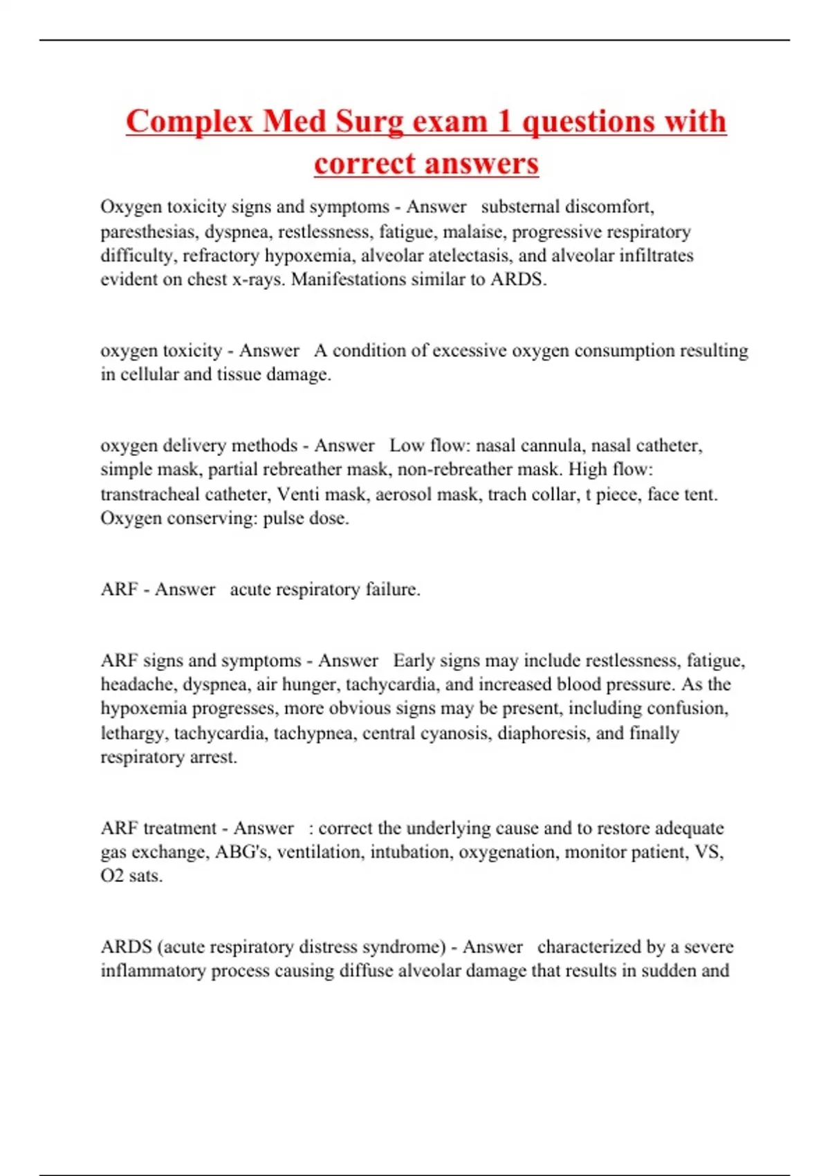 Oxygen toxicity signs and symptoms - Answer substernal discomfort, paresthesias, dyspnea, restlessness, fatigue, malaise, progressive respiratory difficulty, refractory hypoxemia, alveolar atelectasis, and alveolar infiltrates evident on chest x-rays. Manifestations similar to ARDS. oxygen toxicity - Answer A condition of excessive oxygen consumption resulting in cellular and tissue damage. oxygen delivery methods - Answer Low flow: nasal cannula, nasal catheter, simple mask, partial rebreather mask, non-rebreather mask. High flow: transtracheal catheter, Venti mask, aerosol mask, trach collar, t piece, face tent. Oxygen conserving: pulse dose. ARF - Answer acute respiratory failure. ARF signs and symptoms - Answer Early signs may include restlessness, fatigue, headache, dyspnea, air hunger, tachycardia, and increased blood pressure. As the hypoxemia progresses, more obvious signs may be present, including confusion, lethargy, tachycardia, tachypnea, central cyanosis, diaphoresis, and finally respiratory arrest. ARF treatment - Answer : correct the underlying cause and to restore adequate gas exchange, ABG's, ventilation, intubation, oxygenation, monitor patient, VS, O2 sats. ARDS (acute respiratory distress syndrome) - Answer characterized by a severe inflammatory process causing diffuse alveolar d