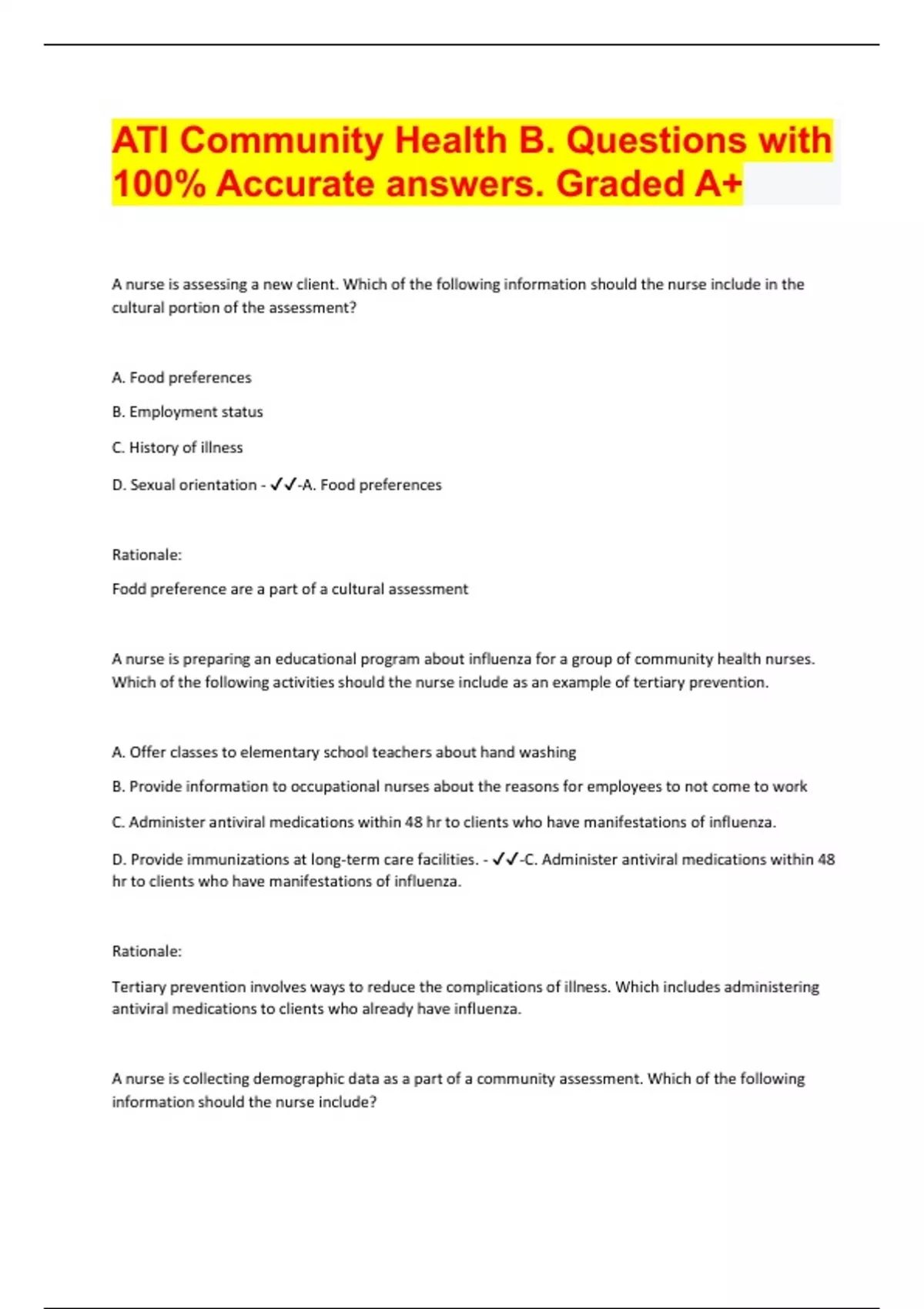 ATI Community Health B. Questions with 100% Accurate answers. Graded A+ Document Content and Description Below A nurse is assessing a new client. Which of the following information should the nurse include in the cultural portion of the assessment? A. Food preferences B. Employment status C. History of il lness D. Sexual orientation - -A. Food preferences Rationale: Fodd preference are a part of a cultural assessment A nurse is preparing an educational program about influenza for a group of community health nurses. Which of the following activities should the nurse include as an example of tertiary prevention. A. Offer classes to elementary school teachers about hand washing B. Provide information to occupational nurses about the reasons for employees to not come to work C. Administer antiviral medications within 48 hr to clients who have manifestations of influenza. D. Provide immunizations at long-term care facilities. - -C. Administer antiviral medications within 48 hr to clients who have manifestations of influenza. Rationale: Tertiary prevention involves ways to reduce the complications of illness. Which includes administering antiviral medications to clients who already have influenza. A nurse is collecting demographic data as a part of a community assessment. Which of the following information should the nurse include? A. Racial distribution B. Family genograms C. Number of open water sources D. Presence of condemned buildings - -A. Racial distribution Rationale: Racial distribution is part of demographic data. A community health nurse suspects an outbreak of scabies in the local area. Which of the following actions should the nurse take first? A. Educate the community about disease transmission B. Determine the incidence rate C. Institute prophylactic treatment D. Discuss treatment plans with the client's families - -B. Determine the incidence rate Rationale: The first action that the nurse should take when using the nursing process is to determine the number of new cases of scabies in the community A public health nurse is planning care for four clients. Which of the following interventions should the nurse recognize as tertiary prevention? A. Providing chemoprophylaxis for malaria to a client who is traveling to mosquito-infested countries. B. Performing a serologicial screening for HIV for a client who is pregnant C. Participating in partner notification for a client who has an STI D. Administering antibiotics to a client who has AIDS and was diagnosed with Pneumocystis jiroveci - -D. Administering antibiotics to a client who has AIDS and was diagnosed with Pneumocystis jiroveci Rationale: Administering antibiotics to a client who has AIDS and was diagnosed with Pneumocystis jiroveci is an example of tertiary prevention. A home health nurse is assessing an older adult client who is taking captopril to treat heart failure. Which of the following findings should the nurse identify as an adverse effect of this medication? A. Weight gain B. Ataxia C. Photophobia D. Dry cough - -D. Dry cough Rationale: Captopril prevents the conversion of angiotensin I to angiotensin II, causing bradykinin to accumulate. The client ma experience coughing as a result of bradykinin accumulation. A home health nurse is caring for a client who has breast cancer. Which of the following assessment findings should the nurse identify as an indication that the client is copying effectively? A. Inability to concentrate B. Makes eye contact C. Excessive sleeping D. Lack of interest in food - -B. Makes eye contact Rationale: The nurse should recognize that making eye contact is a characteristic of effective coping. A public health nurse is providing information to a client who has alcohol use disorder and is asking about treatment. Which of the following statements should the nurse identify as an indication that the client understands the information? A. "I will not hae to completely stop drink alcohol if I go into an inpatient treatment program." B. "Once I make it through detoxification, I will be free of my addiction." C. "I am not eligible for an outpatient program until I have completed an inpatient program first." D. "I can expect to get help with other aspects of my life while in treatment." - -D. "I can expect to get help with other aspects of my life while in treatment." Rationale: Successful treatment of alcohol use disorder is more likely if the client receives help in other areas of his life, such as his physical health, psychological well-being, and family interactions. The daughter of a client who is terminally ill and at the end of life approaches a hospice nurse and asks what she can do to help relieve her father's pain. Which of the following interventions should the nurse suggest? A. Give the client brief hand massages B. Increase the illumination in the room C. Place a warm cloth on the patient's forehand D. Administer citalopram when the client is agitated - -A. Give the client brief hand massages Rationale: Soft massages and brief hand massages can reduce pain and stress in palliative care settings A community health nurse is developing a plan of care for a client who is Hispanic. Which of the following actions should the nurse include in the plan? A. Avoid using hand gestures when working with the client B. Use therapeutic touch during conversation C. Discourage the client from using a faith healer D. Maintain direct eye contact when speaking with the client - -B. Use therapeutic touch during conversation Rationale: A client who is Hispanic might view touch as a gesture of caring and compassion A nurse is caring for a client who has AIDS and is experiencing rapid weight loss. Which of the following actions should the nurse take first? A. Examine the client's oral mucous membranes B. Encourage the client to consume 1.2 to 2.0 g/kg pf protein daily C. Recommend the client increase her daily calorie intake by 25% D. Teach the client about findings that should be reported to the provider - -A