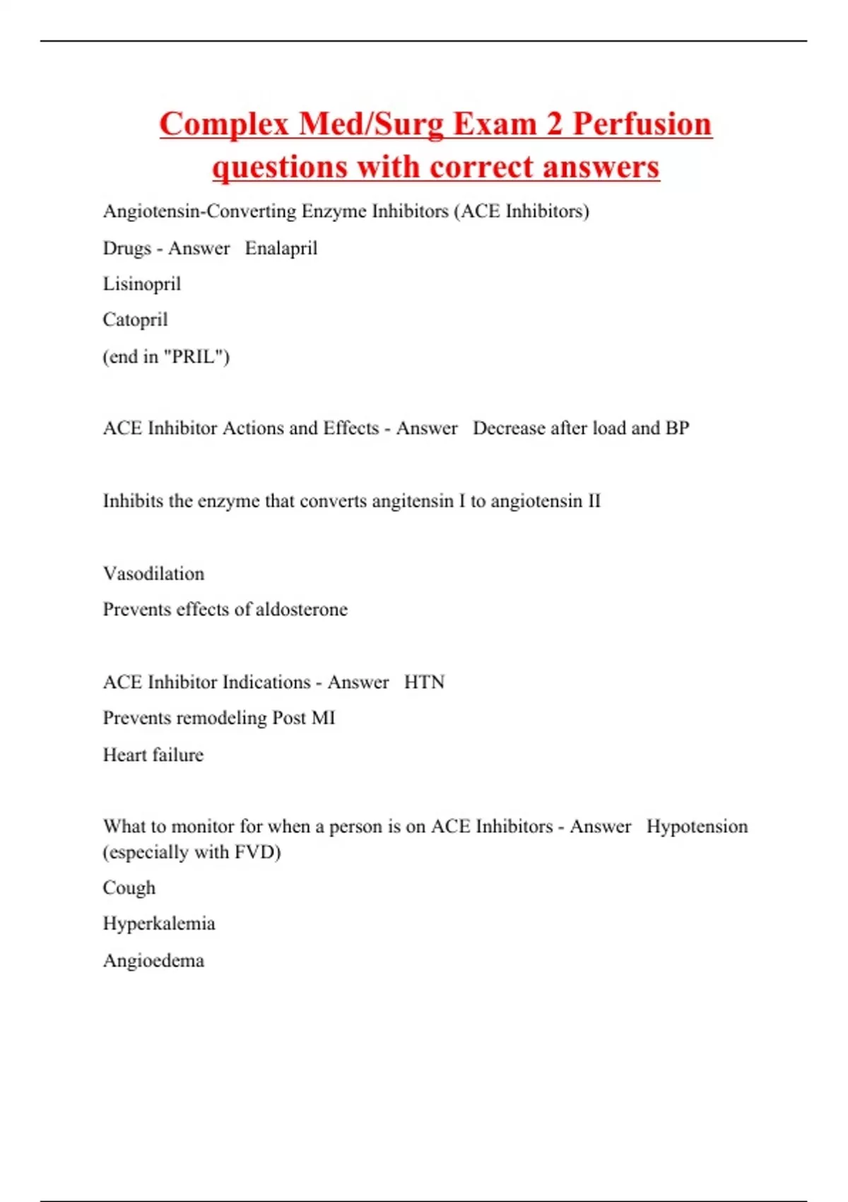 Angiotensin-Converting Enzyme Inhibitors (ACE Inhibitors) Drugs - Answer Enalapril Lisinopril Catopril (end in "PRIL") ACE Inhibitor Actions and Effects - Answer Decrease after load and BP Inhibits the enzyme that converts angitensin I to angiotensin II Vasodilation Prevents effects of aldosterone ACE Inhibitor Indications - Answer HTN Prevents remodeling Post MI Heart failure What to monitor for when a person is on ACE Inhibitors - Answer Hypotension (especially with FVD) Cough Hyperkalemia Angioedema