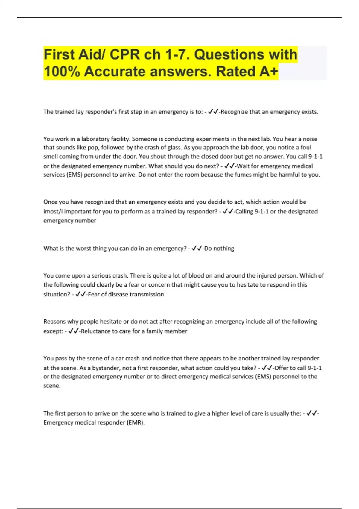 First Aid/ CPR ch 1-7. Questions with 100% Accurate answers. Rated A+ Document Content and Description Below The trained lay responder's first step in an emergency is to: - -Recognize that an emergency exists. You work in a laboratory facility. Someone is conducting experiments in the next lab. You hear a noise that sounds like pop, followed by the crash of glass. As you approach the lab door, you notice a foul smell coming from under the door. You shout through the closed door but get no answer. You call 9-1-1 or the designated emergency number. What should you do next? - -Wait for emergency medical services (EMS) personnel to arrive. Do not enter the room because the fumes might be harmful to you. Once you have recognized that an emergency exists and you decide to act, which action would be imost/i important for you to perform as a trained lay responder? - -Calling 9-1-1 or the designated emergency number What is the worst thing you can do in an emergency? - -Do nothing You come upon a serious crash. There is quite a lot of blood on and around the injured person. Which of the following could clearly be a fear or concern that might cause you to hesitate to respond in this situation? - -Fear of disease transmission Reasons why people hesitate or do not act after recognizing an emergency include all of the following except: - -Reluctance to care for a family member You pass by the scene of a car crash and notice that there appears to be another trained lay responder at the scene. As a bystander, not a first responder, what action could you take? - -Offer to call 9-1-1 or the designated emergency number or to direct emergency medical services (EMS) personnel to the scene. The first person to arrive on the scene who is trained to give a higher level of care is usually the: - -Emergency medical responder (EMR). Which of the following would be ileast /ilikely to be considered a fear or concern that would prevent a person from acting in an emergency? - -Feeling confident in first aid training and ability You are caring for a person involved in a crash when that person suddenly becomes uncooperative and threatens to hurt you. What should you do? - -Withdraw and wait for EMS personnel to arrive. When handling an emergency involving an adult, you perform the three emergency action steps correctly by doing which of the following? - -Checking the scene and the person, calling 9-1-1 or the designated emergency number, then caring for the person Checking the scene by performing a scene size-up lets you do all of the following except: - -Keep bystanders from interfering. Which of the following is the most important reason for checking the scene before approaching to help an injured or ill person? - -You might become injured or ill yourself if the scene is unsafe. You must call 9-1-1 or the designated emergency number immediately when which one of the following conditions exists? - -The person has trouble breathing. How can bystanders be helpful to you while you are checking the scene? - -Calling 9-1-1 or the designated emergency number, or retrieving first aid supplies Which of the following would be ileast/i likely to promote transmission of bloodborne pathogens? - -Shaking hands with an infected person You come upon the scene of a crash and you see one person obviously injured with a cut on the forehead. What precautions against disease transmission would you take when caring for the injured person? - -Wear disposable latex-free