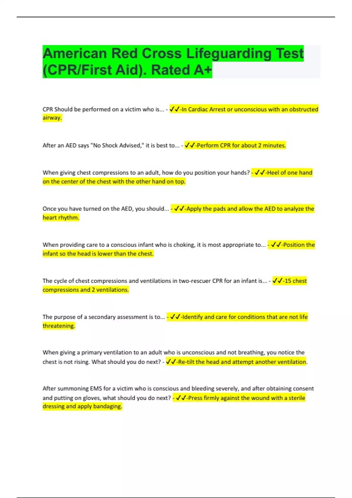 American Red Cross Lifeguarding Test (CPR/First Aid). Rated A+ Document Content and Description Below CPR Should be performed on a victim who is... - -In Cardiac Arrest or unconscious with an obstructed airway. After an AED says "No Shock Advised," it is best to... - -Perform CPR for ab out 2 minutes. When giving chest compressions to an adult, how do you position your hands? - -Heel of one hand on the center of the chest with the other hand on top. Once you have turned on the AED, you should... - -Apply the pads and allow the AED to analyze the heart rhythm. When providing care to a conscious infant who is choking, it is most appropriate to... - -Position the infant so the head is lower than the chest. The cycle of chest compressions and ventilations in two-rescuer CPR for an infant is... - -15 chest compressions and 2 ventilations. The purpose of a secondary assessment is to... - -Identify and care for conditions that are not life threatening. When giving a primary ventilation to an adult who is unconscious and not breathing, you notice the chest is not rising. What should you do next? - -Re-tilt the head and attempt another ventilation. After summoning EMS for a victim who is conscious and bleeding severely, and after obtaining consent and putting on gloves, what should you do next? - -Press firmly against the wound with a sterile dressing and apply bandaging. The bleachers at a swim meet suddenly collapse. Out of all the symptoms in the crowd, you should first care for... - -An unconscious victim. A victim has slurred speech, cannot lift their right arm level with the left, is unable to smile and half her face is drooping. What would you assume has happened? - -A stroke. As the only lifeguard performing CPR on an 7-y