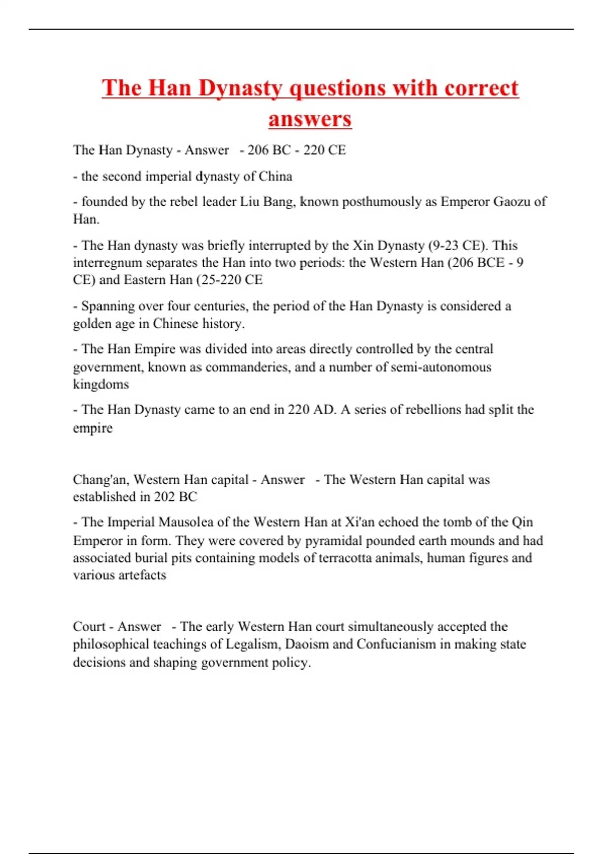 the han dynasty questions with correct answers