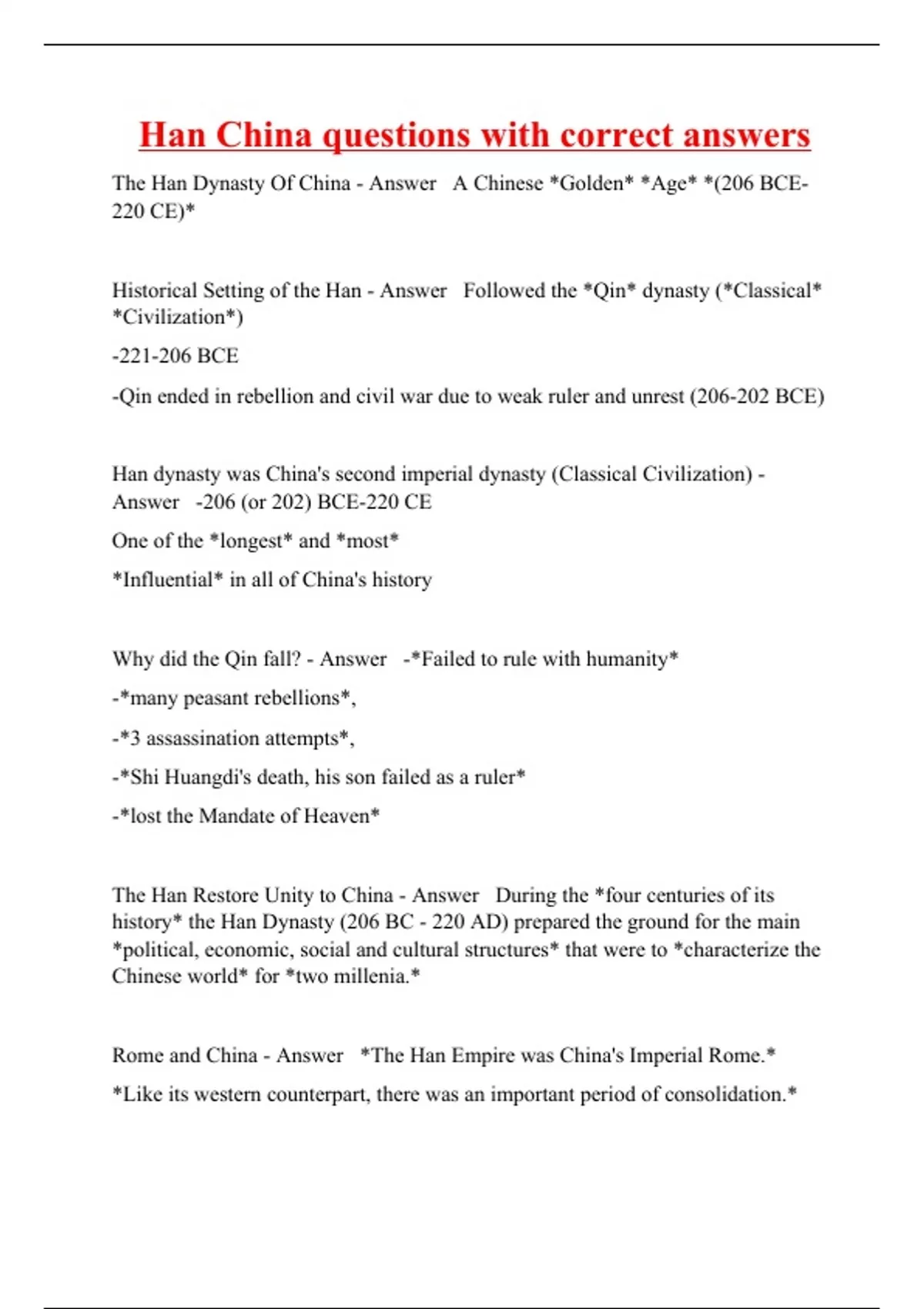 The Han Dynasty Of China - Answer A Chinese *Golden* *Age* *(206 BCE- 220 CE)* Historical Setting of the Han - Answer Followed the *Qin* dynasty (*Classical* *Civilization*) -221-206 BCE -Qin ended in rebellion and civil war due to weak ruler and unrest (206-202 BCE) Han dynasty was China's second imperial dynasty (Classical Civilization) - Answer -206 (or 202) BCE-220 CE One of the *longest* and *most* *Influential* in all of China's history Why did the Qin fall? - Answer -*Failed to rule with humanity* -*many peasant rebellions*, -*3 assassination attempts*, -*Shi Huangdi's death, his son failed as a ruler* -*lost the Mandate of Heaven*