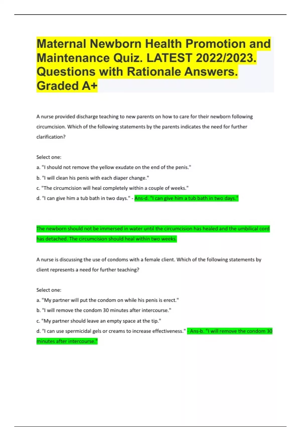 Maternal Newborn Health Promotion and Maintenance Quiz. LATEST 2022/2023. Questions with Rationale Answers. Graded A+ Document Content and Description Below A nurse provided discharge teaching to new parents on how to care for their newborn following circumcision. Which of the following statements by the parents indicates the need for further clarificatio n? Select one: a. "I should not remove the yellow exudate on the end of the penis." b. "I will clean his penis with each diaper change." c. "The circumcision will heal completely within a couple of weeks." d. "I can give him a tub bath in two days." - Ans-d. "I can give him a tub bath in two days." The newborn should not be immersed in water until the circumcision has healed and the umbilical cord has detached. The circumcision should heal within two weeks. A nurse is discussing the use of condoms with a female client. Which of the following statements by client represents a need for further teaching? Select one: a. "My partner will put the condom on while his penis is erect." b. "I will remove the condom 30 minutes after intercourse." c. "My partner should leave an empty space at the tip." d. "I can use spermicidal gels or creams to increase effectiveness." - Ans-b. "I will remove the condom 30 minutes after intercourse." To avoid any semen spillage onto the vulva or the vaginal area, the condom must be removed the same time as the penis. To do that the condom rim should be held in place while the penis is withdrawn from the vagina. A client reports awaking from sleep by contractions that are occurring every five minutes and lasting 30-40 seconds. Which of the following questions should the nurse ask to assess for true labor versus false labor? Select one: a. "When did your contractions begin?" b. "Have you noticed any bloody show or fluid coming from your vagina?" c. "What happens to your contractions when you move about?" d. "Have you felt fetal movement over the last 24 hours?" - Ans-b. "Have you noticed any bloody show or fluid coming from your vagina?" Vaginal discharge of blood or fluid may indicate cervical dilation, and potentially rupture of membranes. False labor is characterized by painless, irregular, and intermittent contractions that decrease in frequency, duration, and intensity with walking or position changes. Contractions are felt in the lower back or above the umbilicus and often stop with comfort measures (like oral hydration). There is usually no vaginal discharge with false labor. False labor is characterized by painless, irregular, and intermittent contractions that decrease in frequency, duration, and intensity with walking or position changes. Telling the client to walk is not a correct response because it is an intervention rather than an assessment question. The client who is scheduled for a nonstress test (NST) asks the nurse to explain the purpose of the test. Which of the following is the correct response? Select one: a. The purpose of the NST is to assess the fetal CNS. b. The purpose of the NST helps to determine gestational age. c. The purpose of the NST is to determine fetal lie. d. The purpose of the NST is to determine fetal breathing. - Ans-a. The purpose of the NST is to assess the fetal CNS. This is the primary purpose of a NST. The test monitors the response of the FHR to fetal movement. This allows the nurse to assess the FHR in relationship to the fetal movement A client in the early postpartum period is talkative and enjoys recounting the details of her labor and birth. The nurse recognizes that the behaviors must likely indicate which of the following? Select one: a. The taking-hold phase of maternal psychosocial adaptation. b. The taking-in phase of maternal postpartum adjustment. c. Postpartum role transition. d. Positive mother-infant bonding. - Ans-b. The taking-in phase of maternal postpartum adjustment. The taking-in phase begins immediately following birth and lasts a few hours to a couple of days. It is characterized by the mother being excited and talkative, reliving her birthing experience, and focusing on her own needs and the overall health of her newborn. The taking-hold phase of maternal postpartum adjustment begins on the second to third post-partum day and lasts 10 days to several weeks. The woman's focus is on exerting her independence in competently caring for her newborn. She may verbalize fears of incompetence or anxiety about exhaustion, and needs acceptance and encouragement. Postpartum depression may occur during this time. A nurse is positioning a client on the operating room table in preparation for a cesarean birth. Which of the following is the correct position? Select one: a. Lithotomy position with a foam wedge behind the shoulders. b. Supine position with foam wedge positioned under one hip. C c. Modified Trendelenburg position with a foam wedge under the legs. d. Left lateral position with a foam wedge between the legs. - Ans-b. Supine position with foam wedge positioned under one hip. The supine position is appropriate for abdomina