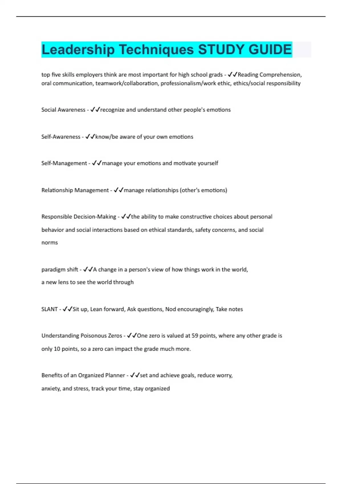 top five skills employers think are most important for high school grads - Reading Comprehension, oral communication, teamwork/collaboration, professionalism/work ethic, ethics/social responsibility Social Awareness - recognize and understand other people's emotions Self-Awareness - know/be aware of your own emotions Self-Management - manage your emotions and motivate yourself Relationship Management - manage relationships (other's emotions) Responsible Decision-Making - the ability to make constructive choices about personal behavior and social interactions based on ethical standards, safety concerns, and social norms paradigm shift - A change in a person's view of how things work in the world, a new lens to see the world through SLANT - Sit up, Lean forward, Ask questions, Nod encouragingly, Take notes Understanding Poisonous Zeros - One zero is valued at 59 points, where any other grade is only 10 points, so a zero can impact the grade much more. Benefits of an Organized Planner - set and achieve goals, reduce worry, anxiety, and stress, track your time, stay organized