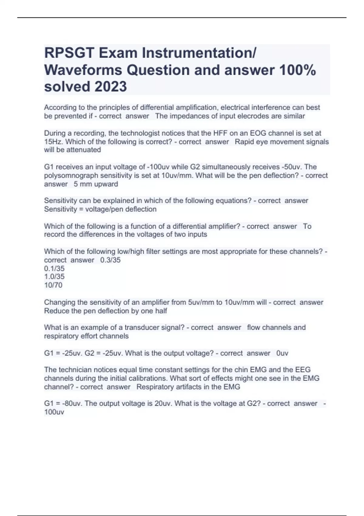 RPSGT Exam Instrumentation/ Waveforms Question and answer 100% solved 2023According to the principles of differential amplification, electrical interference can best be prevented if The impedances of input elecrodes are similar During a recording, the technologist notices that the HFF on an EOG channel is set at 15Hz. Which of the following is correct? Rapid eye movement signals will be attenuated G1 receives an input voltage of -100uv while G2 simultaneously receives -50uv. The polysomnograph sensitivity is set at 10uv/mm. What will be the pen deflection? 5 mm upward Sensitivity can be explained in which of the following equations? Sensitivity = voltage/pen deflection Which of the following is a function of a differential amplifier? To record the differences in the voltages of two inputs Which of the following low/high filter settings are most appropriate for these channels? 0.3/35 0.1/35 1.0/35 10/70 Changing the sensitivity of an amplifier from 5uv/mm to 10uv/mm will Reduce the pen deflection by one half What is an example of a transducer signal? flow channels and respiratory effort channels G1 = -25uv. G2 = -25uv. What is the output voltage? 0uv The technician notices equal time constant settings for the chin EMG and the EEG channels during the initial calibrations. What sort of effects might one see in the EMG channel? Respiratory artifacts in the EMG G1 = -80uv. The output voltage is 20uv. What is the voltage at G2? -100uv The tech is setting up the Grass Polysomnograph. They perform machine calibrations by applying a 50uv voltage to each input. The machine sensitivity is set at 5uv/mm. What should be the height of each pen deflection? 10 mm A low filter is set at 1hz. Which of the following statements are true? signals at 1hz will be attenuated and may lead to an under scoring of SWS Which of the following filter combinations would be most appropriate for recording the EEG in polysomnography? LFF = 0.3hz HFF = 30hz Which of the following is not a bioelectric potential recording? Respiratory airflow