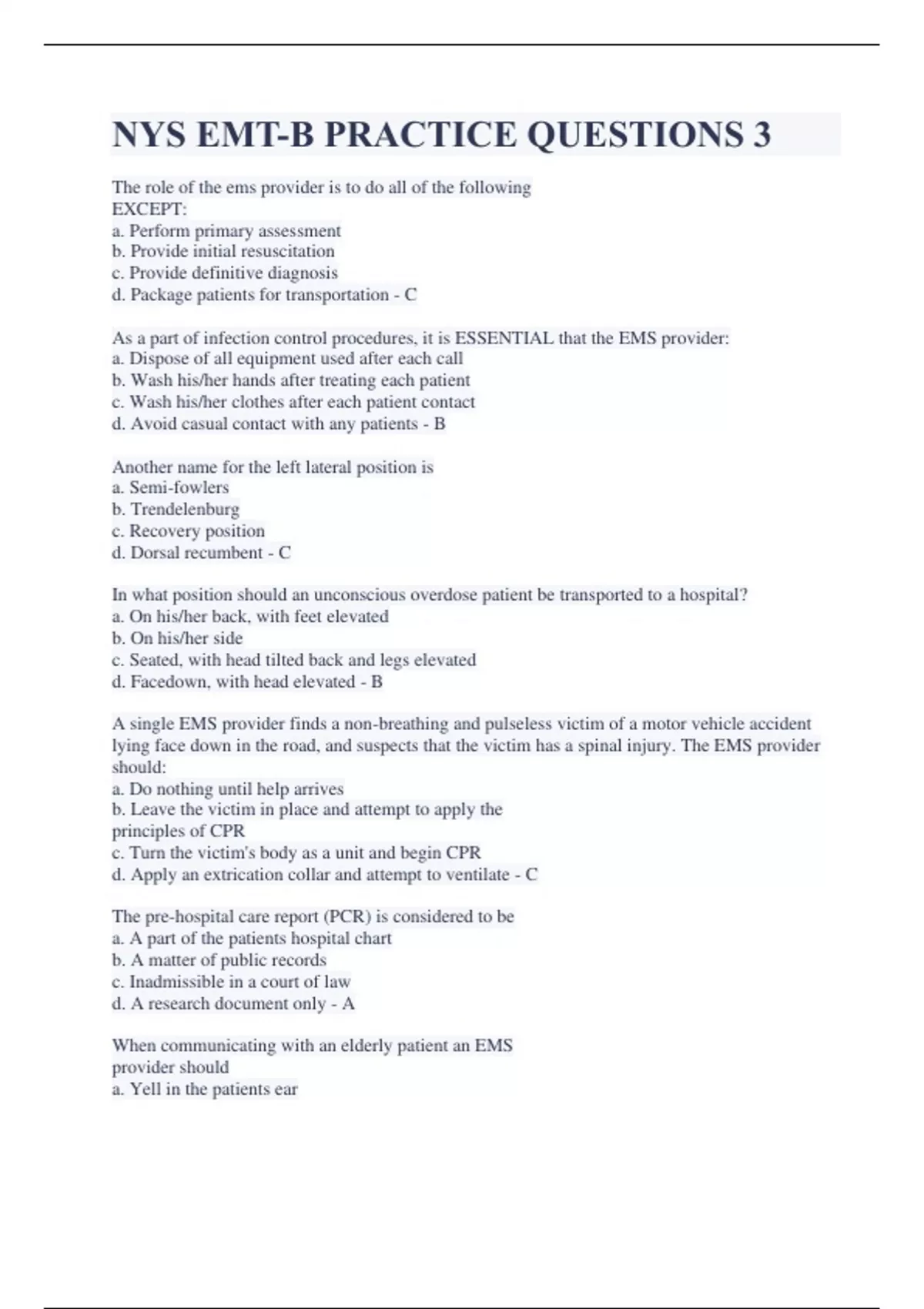 NYS EMT-B PRACTICE QUESTIONS 3 VERIFIED A+