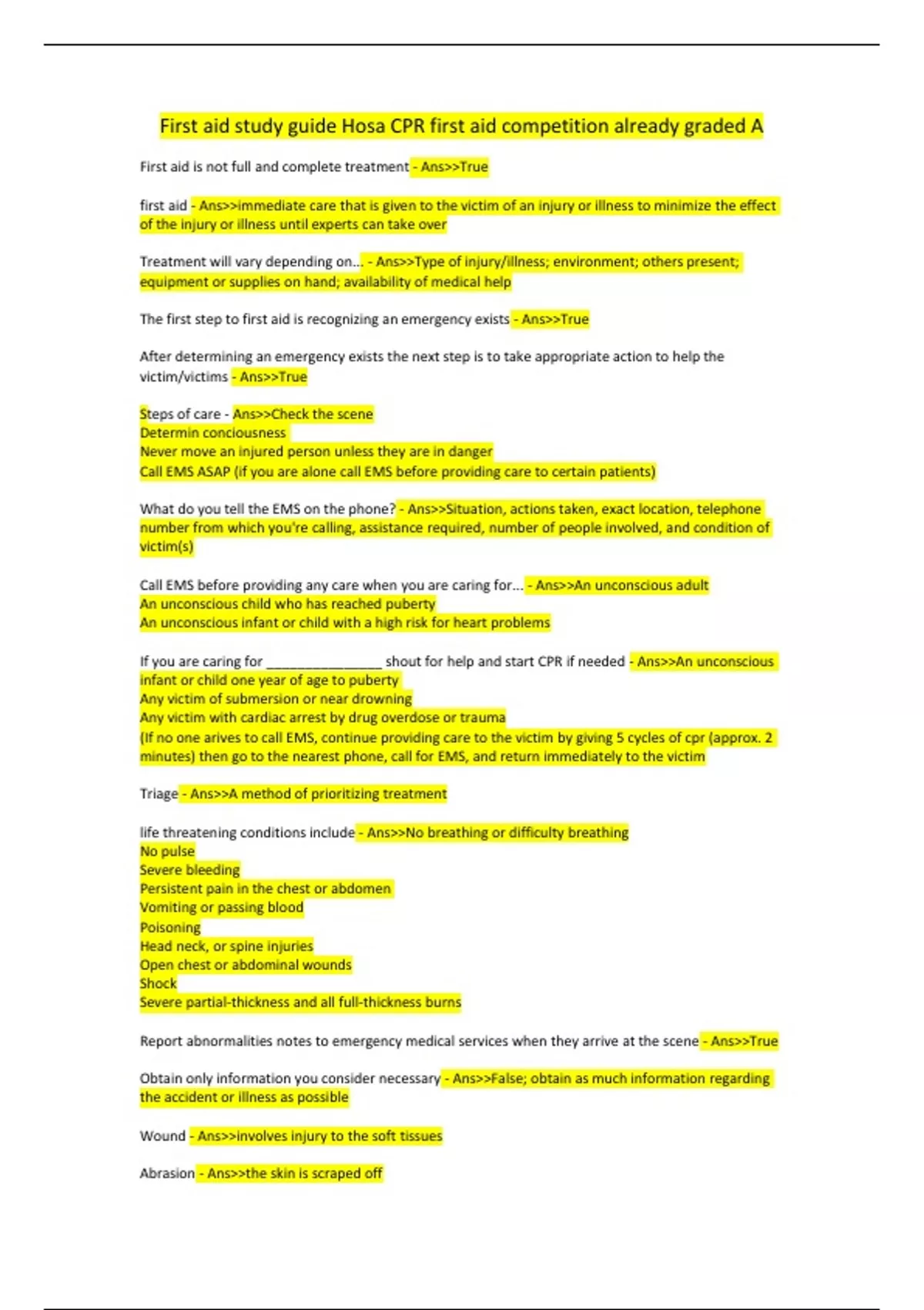 First aid study guide Hosa CPR competition already graded A