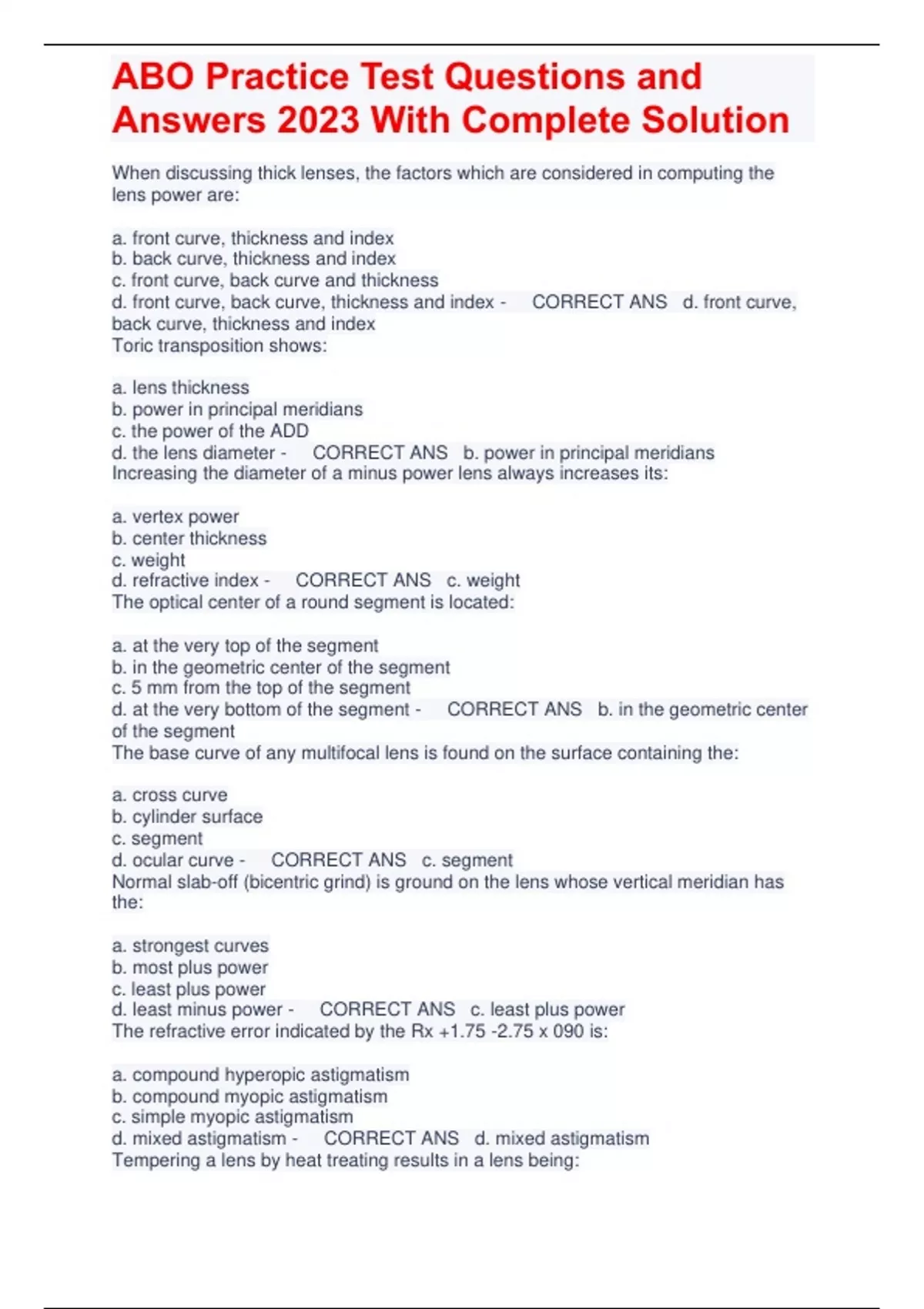 When discussing thick lenses, the factors which are considered in computing the lens power are: a. front curve, thickness and index b. back curve, thickness and index c. front curve, back curve and thickness d. front curve, back curve, thickness and index - CORRECT ANS d. front curve, back curve, thickness and index Toric transposition shows: a. lens thickness b. power in principal meridians c. the power of the ADD d. the lens diameter - CORRECT ANS b. power in principal meridians Increasing the diameter of a minus power lens always increases its: a. vertex power b. center thickness c. weight d. refractive index - CORRECT ANS c. weight The optical center of a round segment is located: a. at the very top of the segment b. in the geometric center of the segment c. 5 mm from the top of the segment d. at the very bottom of the segment - CORRECT ANS b. in the geometric center of the segment The base curve of any multifocal lens is found on the surface containing the: a. cross curve b. cylinder surface c. segment d. ocular curve - CORRECT ANS c. segment Normal slab-off (bicentric grind) is ground on the lens whose vertical meridian has the: a. strongest curves b. most plus power c. least plus power d. least minus power - CORRECT ANS c. least plus power The refractive error indicated by the Rx +1.75 -2.75 x 090 is: a. compound hyperopic astigmat