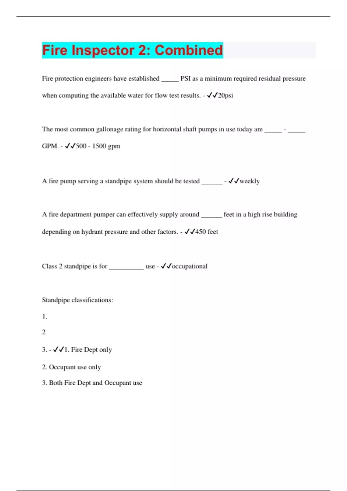 Fire protection engineers have established _____ PSI as a minimum required residual pressure when computing the available water for flow test results. - 20psi The most common gallonage rating for horizontal shaft pumps in use today are _____ - _____ GPM. - 500 - 1500 gpm A fire pump serving a standpipe system should be tested ______ - weekly A fire department pumper can effectively supply around ______ feet in a high rise building depending on hydrant pressure and other factors. - 450 feet Class 2 standpipe is for __________ use - occupational Standpipe classifications: 1. 2 3. - 1. Fire Dept only 2. Occupant use only 3. Both Fire Dept and Occupant useNFPA 13D requires _______ for any sprinkler - 18 GPM Minimum water supply for a class 1 or 3 standpipe system is _____ gpm for at least 30mn with 65psi residual pressure at the highest outlet. - 500