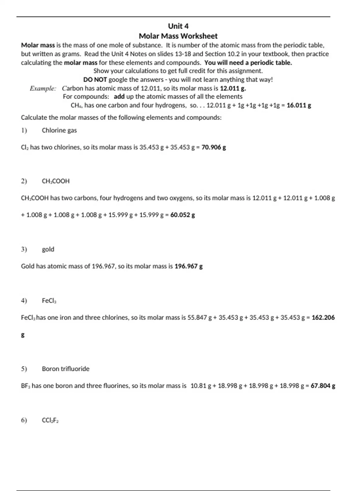 calculating the molar mass for these elements and compounds. You will need a periodic table.