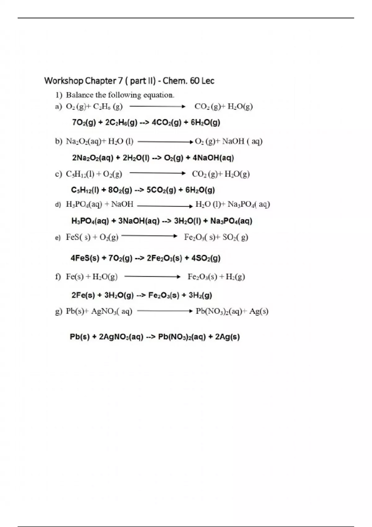A worksheet on balancing chemical equations with examples of various types of chemical reactions.