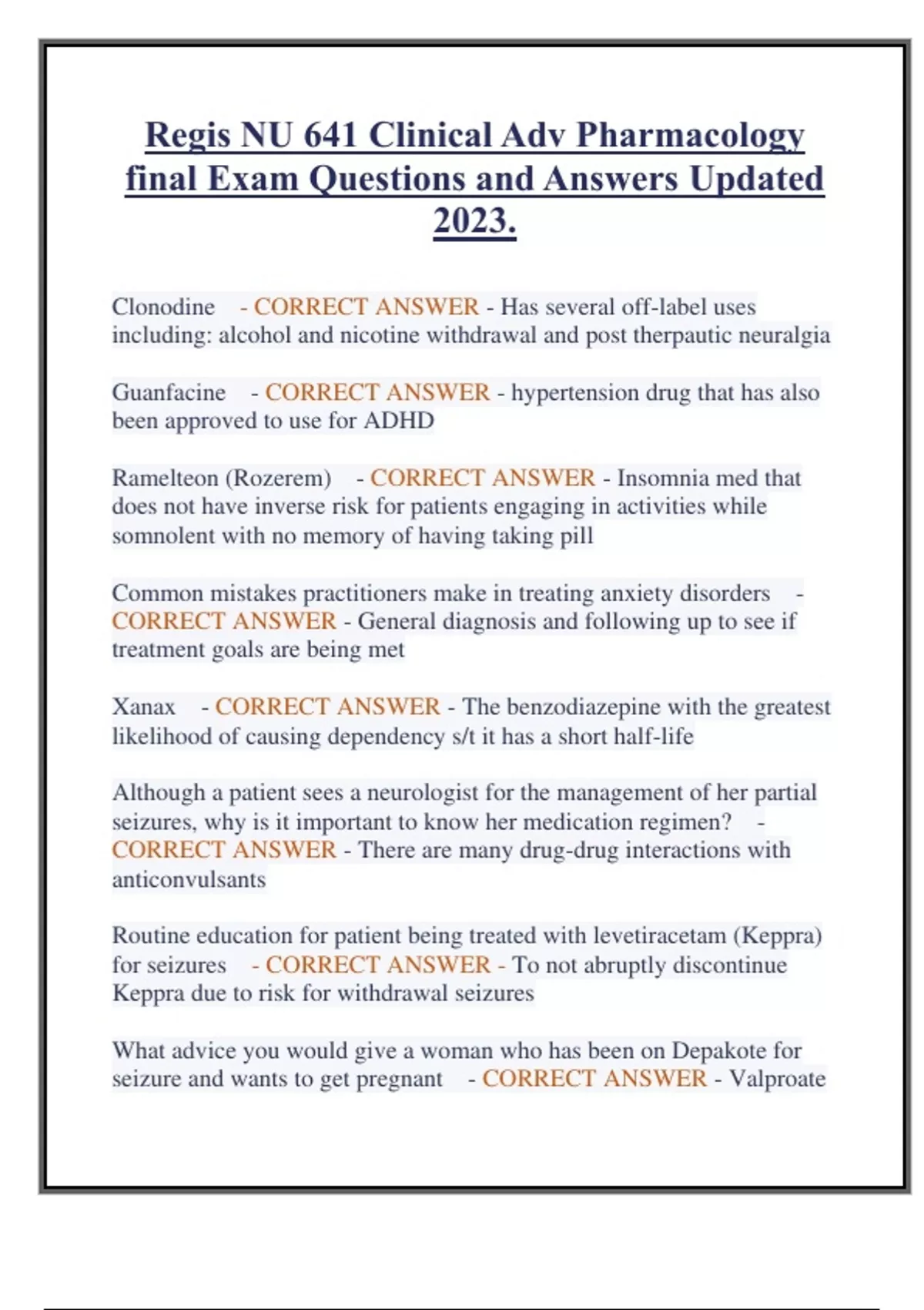 Regis NU 641 Clinical Adv Pharmacology final Exam Questions and Answers Updated 2023. Clonodine - CORRECT ANSWER - Has several off-label uses including: alcohol and nicotine withdrawal and post therpautic neuralgia Guanfacine - CORRECT ANSWER - hypertension drug that has also been approved to use for ADHD Ramelteon (Rozerem) - CORRECT ANSWER - Insomnia med that does not have inverse risk for patients engaging in activities while somnolent with no memory of having taking pill Common mistakes practitioners make in treating anxiety disorders - CORRECT ANSWER - General diagnosis and following up to see if treatment goals are being met Xanax - CORRECT ANSWER - The benzodiazepine with the greatest likelihood of causing dependency s/t it has a short half-life Although a patient sees a neurologist for the management of her partial seizures, why is it important to know her medication regimen? - CORRECT ANSWER - There are many drug-drug interactions with anticonvulsants Routine education for patient being treated with levetiracetam (Keppra) for seizures - CORRECT ANSWER - To not abruptly discontinue Keppra due to risk for withdrawal seizures What advice you would give a woman who has been on Depakote for seizure and wants to get pregnant - CORRECT ANSWER - Valproate is a known teratogen but may be taken after the first trimester if necessary Prior to starting antidepressants, the patient should have lab testing to rule out - CORRECT ANSWER - hypothyroidism